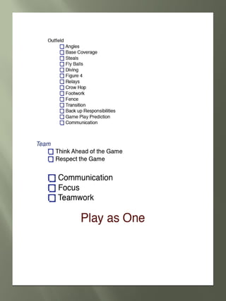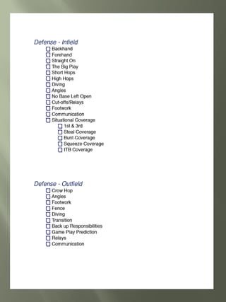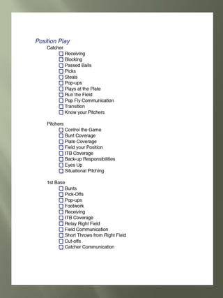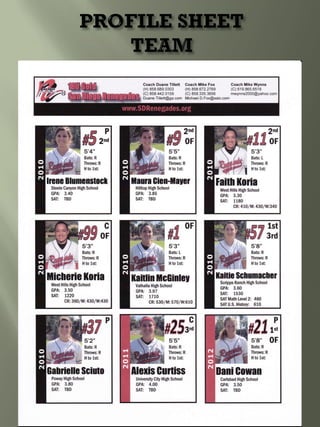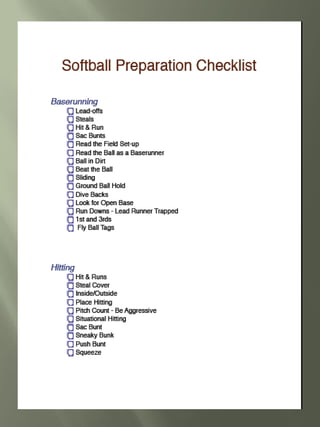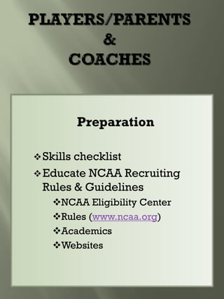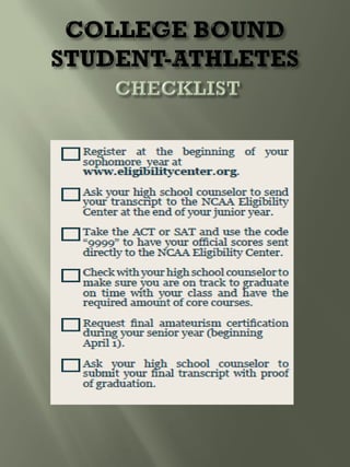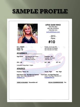 This document provides guidance for student athletes pursuing college softball. It outlines NCAA eligibility requirements including required core courses and minimum GPAs for Division I and II. It emphasizes maintaining good grades, especially in core courses. Coaches are looking at skills, academics, and how the athlete fits the team. The document recommends athletes contact coaches, create a skills video, and find opportunities for coaches to watch them play. Maintaining communication with coaches and following up after games is important.