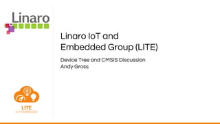 The document discusses the implementation of Device Tree and CMSIS within the Linaro IoT and Embedded Group for Zephyr OS. It outlines how Device Tree facilitates hardware configuration and driver initialization, emphasizing reusability and extensibility, while also detailing the specifics of Zephyr's configuration structure and the intended changes to improve integration with Device Tree. Proposals include consolidating configuration directories, reducing redundancy, and developing tooling to streamline the creation of necessary data structures for board initialization.