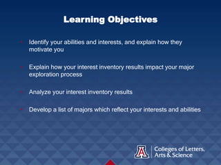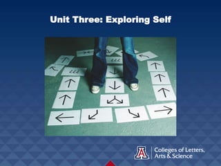 Unit three focuses on exploring self-identity through abilities and interests, analyzing childhood dreams, and understanding their influence on future aspirations. It introduces the Holland Code, categorizing interests into six groups for effective major exploration. The document emphasizes the importance of aligning education with personal interests and skills to achieve fulfilling careers.