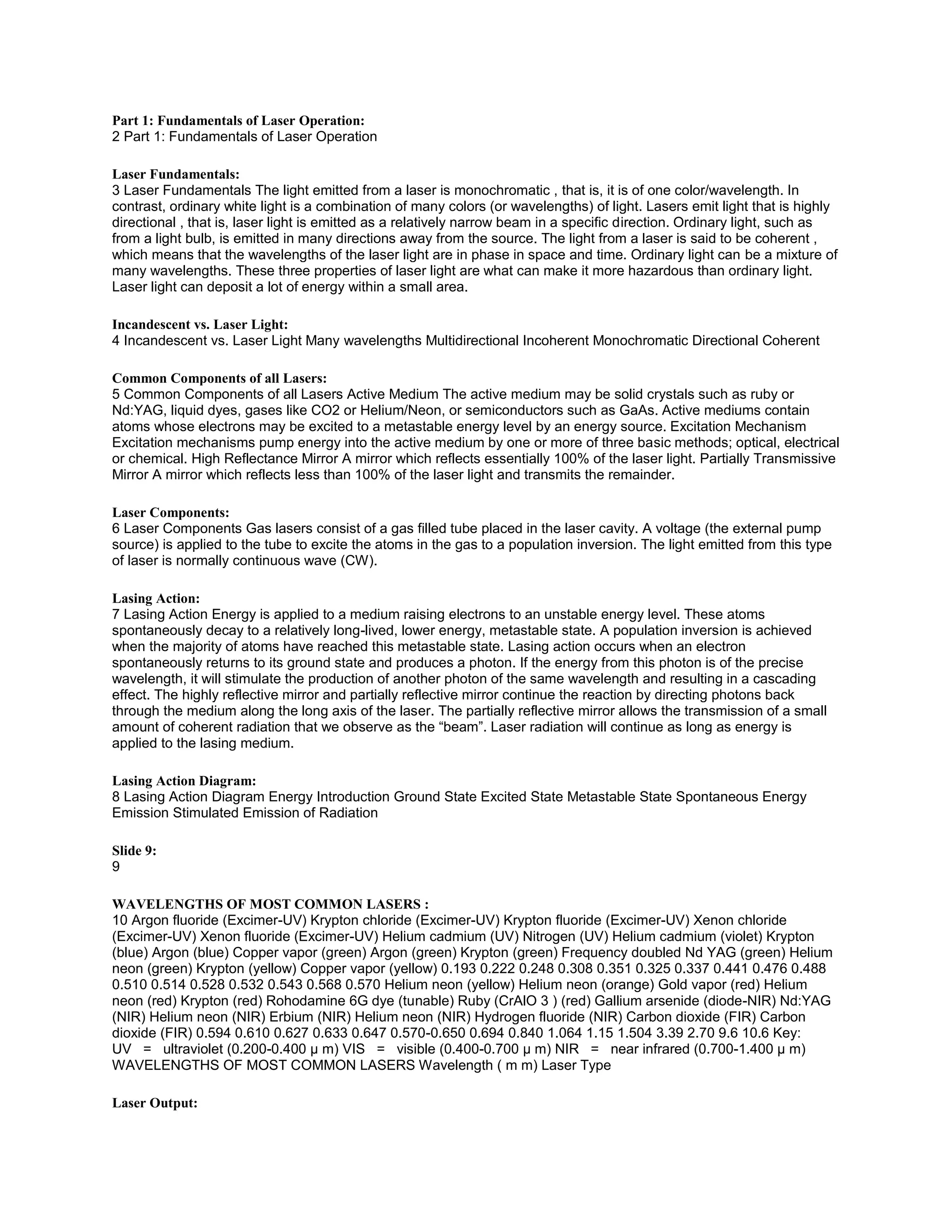 The document provides information on laser fundamentals, hazards, classifications, and safety controls. It discusses how lasers produce monochromatic, coherent, and highly directional light. It describes common laser components and the lasing action that produces stimulated emission. It outlines various laser hazards including those to the eye, skin, and from electrical, chemical, and fire risks. The document discusses laser classification standards and establishes four classes based on power and risk level. It emphasizes the importance of engineering controls, administrative procedures, training, and personal protective equipment to mitigate laser hazards.