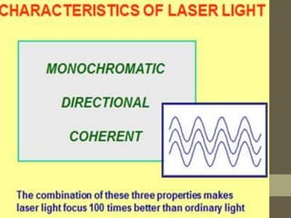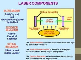 This document discusses the use of lasers in oncosurgery. It begins with a brief history of lasers and their clinical applications. It then describes the components, properties, and classifications of laser devices. The mechanisms of laser tissue interactions like photothermal, photomechanical, and photodynamic effects are explained. Different types of lasers used in surgery like CO2, KTP-argon, and Nd:YAG lasers are outlined. Applications of lasers in oncology, gastrointestinal cancers, liver surgery, neurosurgery, and selective cancer therapy using gold nanorods are summarized.