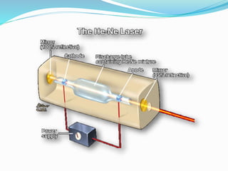Laser beam technology uses stimulated emission of radiation to produce coherent, directional beams of light. A laser works by exciting the electrons in an active medium, such as gases, liquids, or solids, causing them to release photons. Precisely tuned mirrors produce and maintain the laser beam. Lasers emit light of a single wavelength that is highly focused and directional. Common applications include CD/DVD devices, printers, scanners, industrial cutting/welding, medicine, barcodes, holograms, and laser light shows. Lasers also have uses in scientific research, communications, surveying, and military targeting systems.
