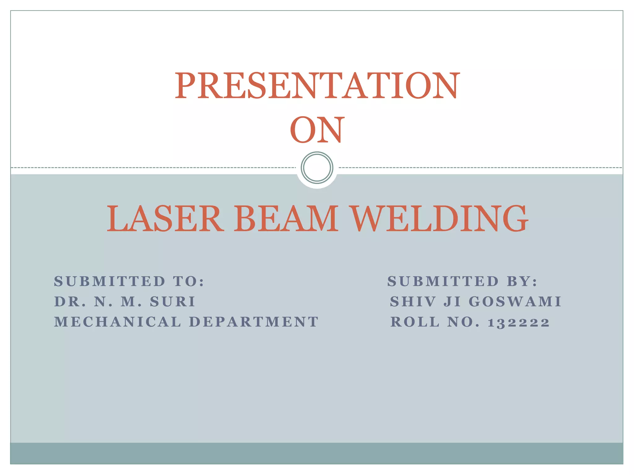 This presentation discusses laser beam welding (LBW), including what a laser beam is, its properties, types of lasers, the LBW process, principles of operation, mechanics, parameters, advantages, and limitations. A laser beam is a powerful, narrow, monochromatic beam created when atoms in a lasing medium are excited by a flash tube, emitting photons. LBW uses the concentrated heat from a laser beam to fuse metals together without filler material. It offers advantages like narrow welds, low distortion, and the ability to weld dissimilar and high-alloy metals. However, it also has high costs and limitations such as difficulty welding thick joints.