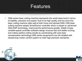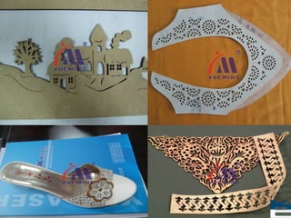 The Yueming Laser is a Chinese laser cutting machine that represents world-class stability, precision, and speed. It uses a SmartCarver controller and auto laser compensation technology for fast and precise cutting. The laser power ranges from 60 to 130 watts and can cut materials up to 25mm thick, depending on the material. It is suitable for industries like signage, leather goods, trophies, gifts, wood engraving, advertising, textiles, and paper goods.