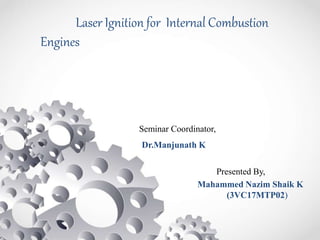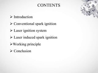The document discusses the concept of laser ignition systems for internal combustion engines as an alternative to conventional spark plugs, highlighting their advantages such as flexibility in ignition location and reduced fuel consumption. It explains the working principle of laser ignition and reports up to 20% fuel consumption reduction compared to traditional methods. Despite the current high costs of laser ignition systems, their potential for improving efficiency and reducing emissions makes them an attractive future option.