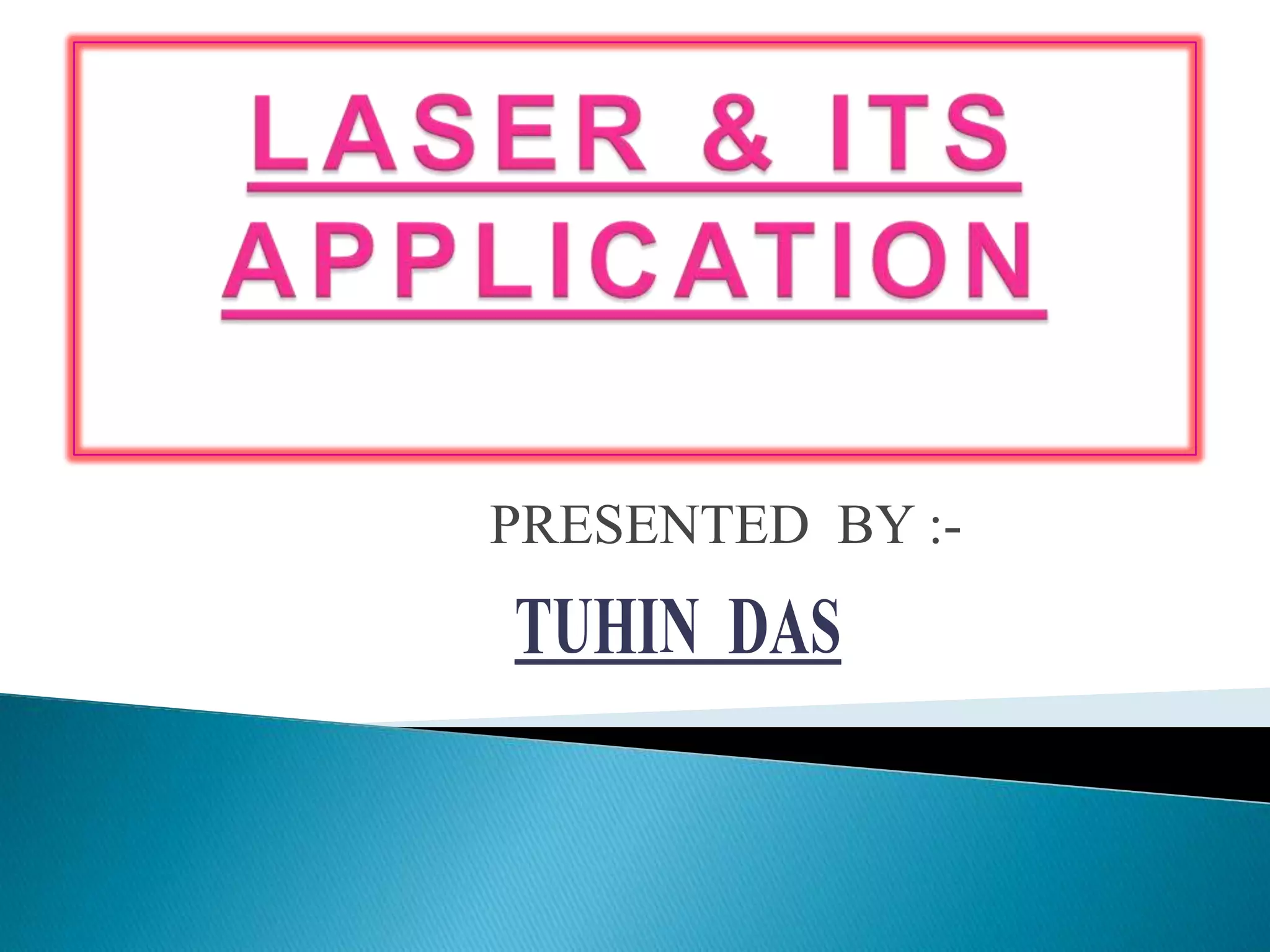 The document summarizes the history and science behind lasers. It discusses how the laser was first conceived in the 1950s and built in 1960. It then explains the basic components of a laser including an energy input source and a gain medium that produces stimulated emission when pumped with energy. Examples of common laser types and materials are provided. Applications of lasers in spectroscopy, surgery, and distance measurements to the moon are also mentioned.
