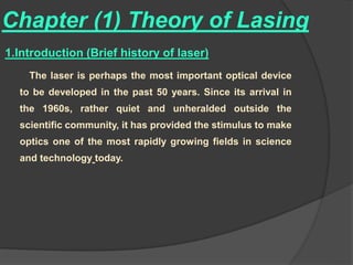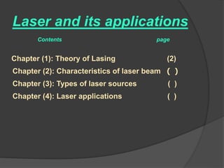 This document provides an overview of laser theory and applications across 4 chapters. Chapter 1 discusses the theory of lasing, including Einstein's theory of stimulated emission and how a population inversion enables light amplification in a laser medium. Chapter 2 will cover characteristics of laser beams. Chapter 3 will describe different types of laser sources. And Chapter 4 will discuss applications of laser technology.