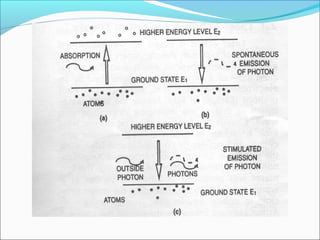 LEDs emit light when connected in a circuit and come in different colors depending on the semiconductor material. LCDs use liquid crystals to control the transmission of light and are used in displays. Lasers produce highly directional, coherent light through stimulated emission and are used for applications like optical communication, reading, and printing due to their small size, efficiency and ability to be modulated at high frequencies. LEDs, LCDs, and lasers each have distinct operating principles and applications in lighting, displays, and other technologies.