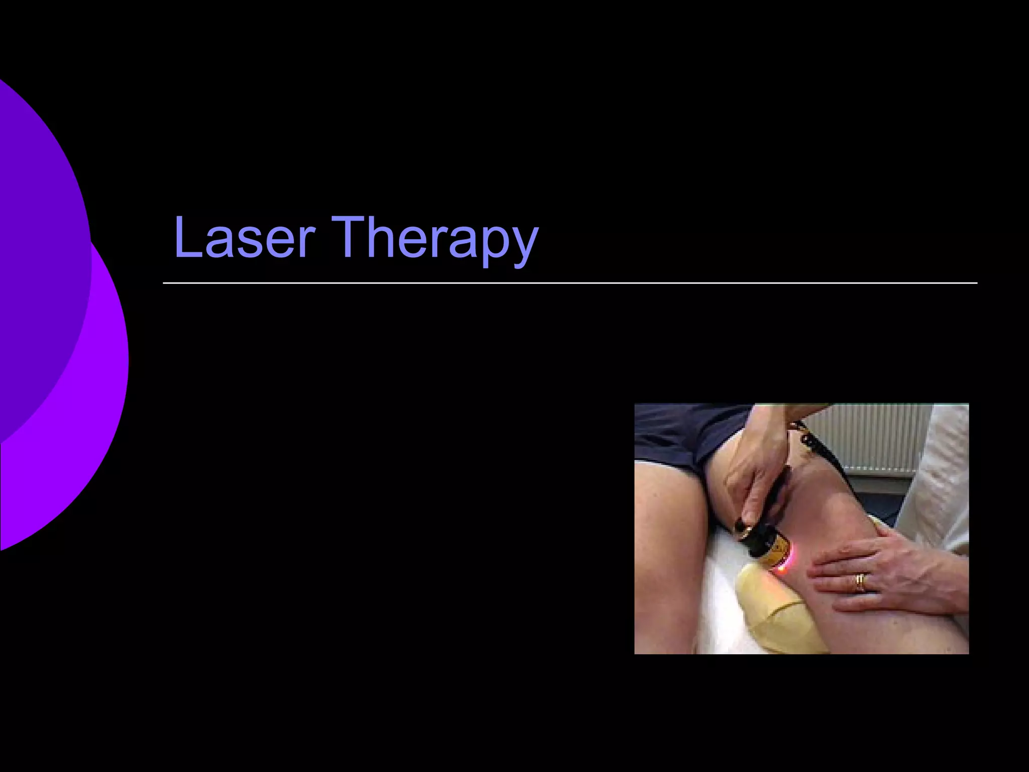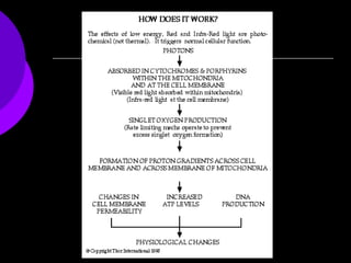 Low-level laser therapy (LLLT) involves applying red or near-infrared light to injuries or lesions to improve wound and soft tissue healing and provide pain relief. LLLT works by stimulating cellular activity through absorption by chromophores like cytochrome c oxidase in the mitochondria. Clinical studies show LLLT can speed wound healing, reduce pain, and treat conditions like tendonitis. While LLLT dosage is challenging to define precisely due to variable beam shapes and densities, clinical results generally improve with higher total energy delivery.