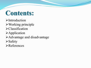 The document discusses laser micromachining, which involves the use of lasers for precise cutting, drilling, and modifications of small features, typically 1 to 999 μm in size. It covers the working principles, types, advantages, and disadvantages of laser micromachining, emphasizing its applications in industries such as automotive and aerospace. Additionally, it highlights safety considerations and the transition from micro to nano-electro-mechanical systems.
