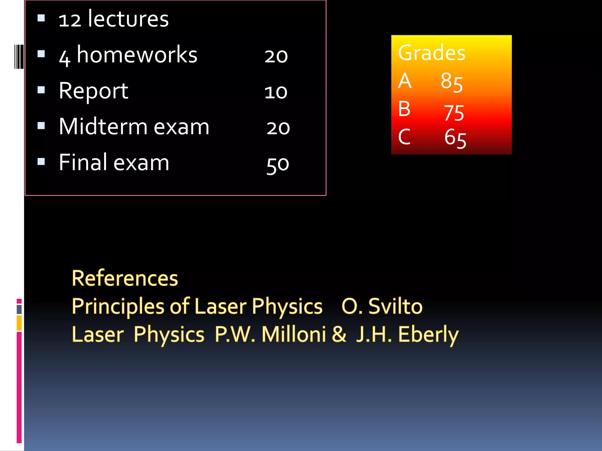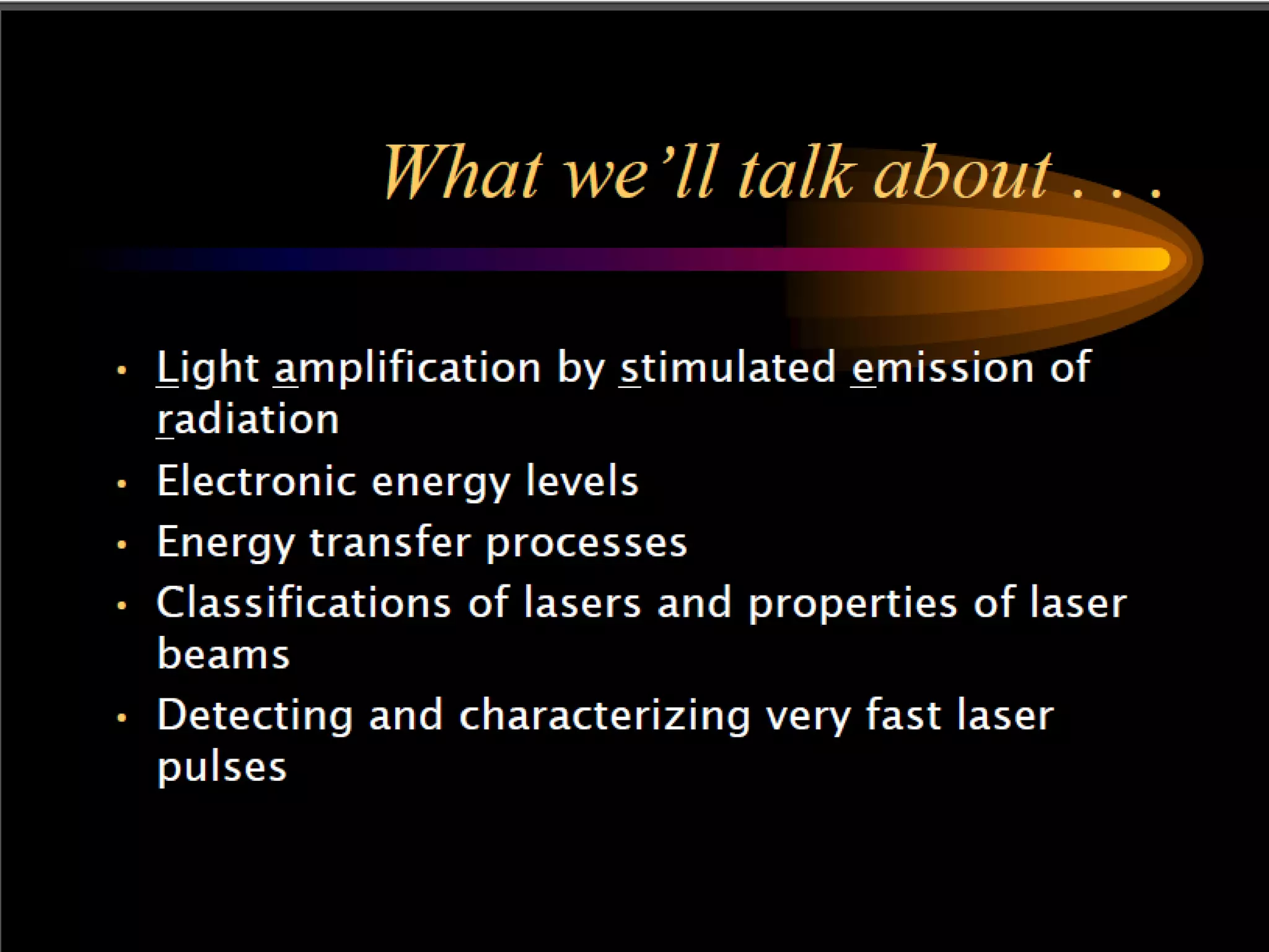 This document outlines the course structure and content for an introduction to laser theory class. The course will include 12 lectures, 4 homework assignments, a midterm exam, final exam, and individual reports. Key topics that will be covered include laser fundamentals, energy levels, rate equations, cavity design, gas lasers, solid state lasers, semiconductor lasers, and other laser types. Lasers can be classified based on their operation mode, population inversion mechanism, or active medium used. The goal is for students to understand the basic scientific principles that enable laser operation.