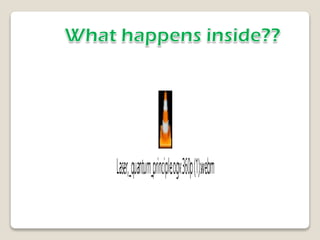 This document discusses different types of lasers, their uses, and laser safety. It describes excimer lasers, dye lasers, and semiconductor lasers. It outlines laser uses in medicine, industry, and everyday life. It also discusses non-beam hazards, laser classifications and labeling, control measures like engineering controls and PPE, and signs used for laser safety.