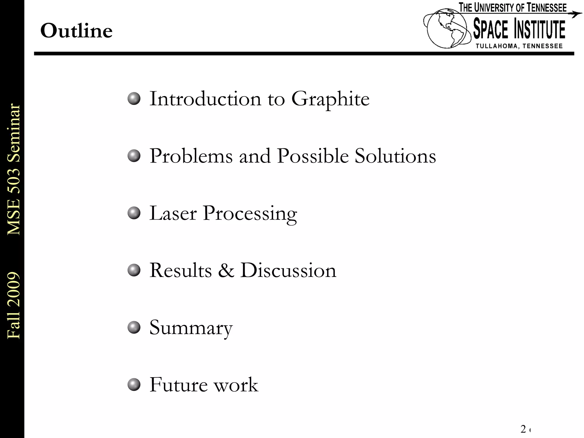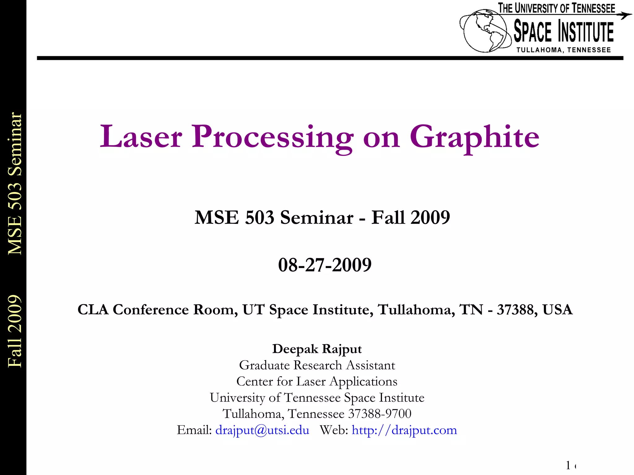 Deepak Rajput presented research on laser processing of graphite. Titanium, zirconium, and niobium coatings were deposited on graphite substrates using the LISI TM process. Characterization found the coatings were fully dense and crack-free with carbide phases formed at the interfaces. A proposed mechanism is laser-assisted self-propagating high temperature synthesis due to the exothermic reactions. Future work includes heat treatment, advanced characterization, and publishing the results.