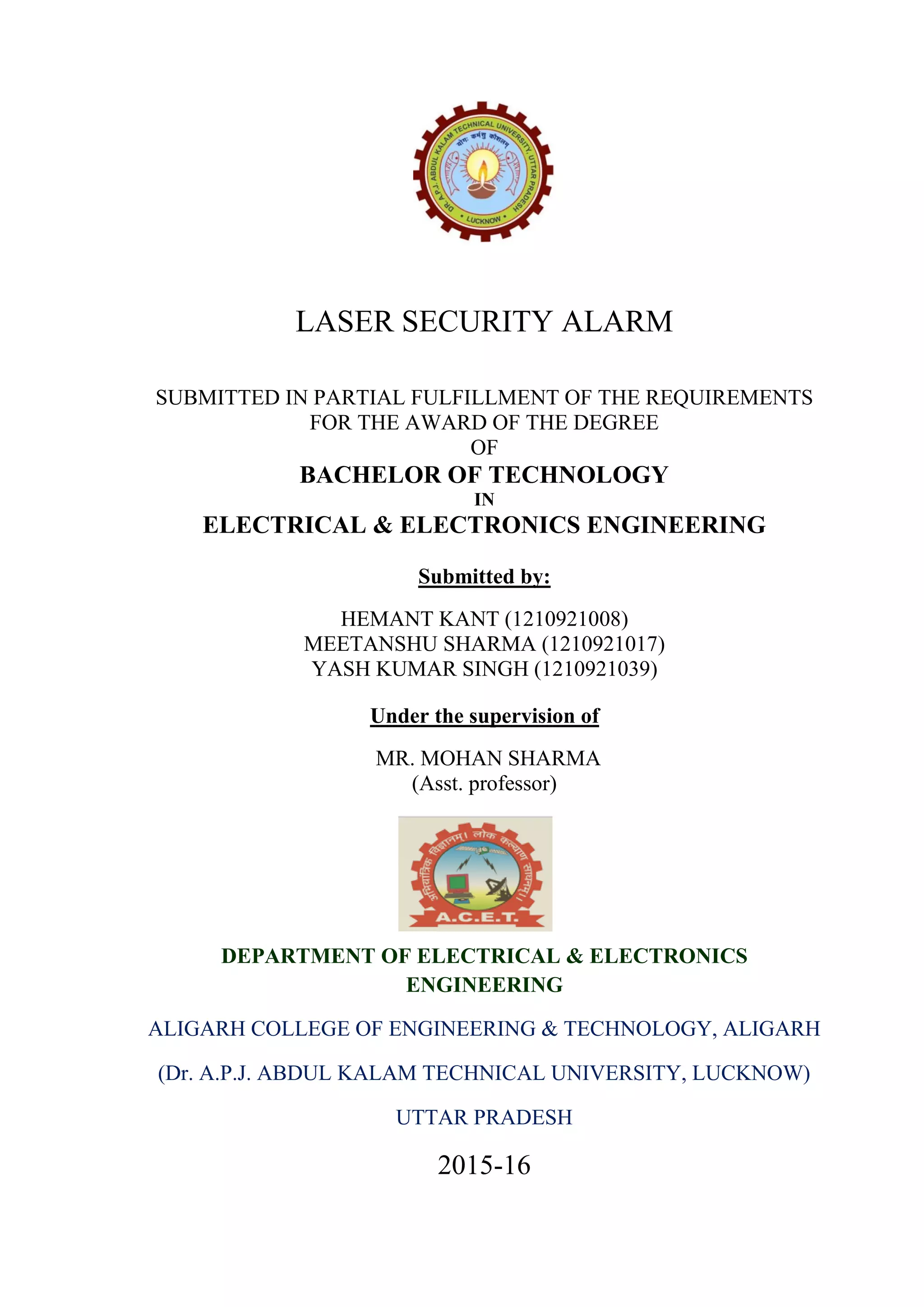 The document discusses a laser security alarm project aimed at enhancing security by utilizing a laser beam to create an invisible boundary around sensitive areas. It includes details on the system components, working principles of lasers and light-dependent resistors, and the project's overall design and implementation. The system is designed to be low-cost, energy-efficient, and effective at alerting users to unauthorized entries.