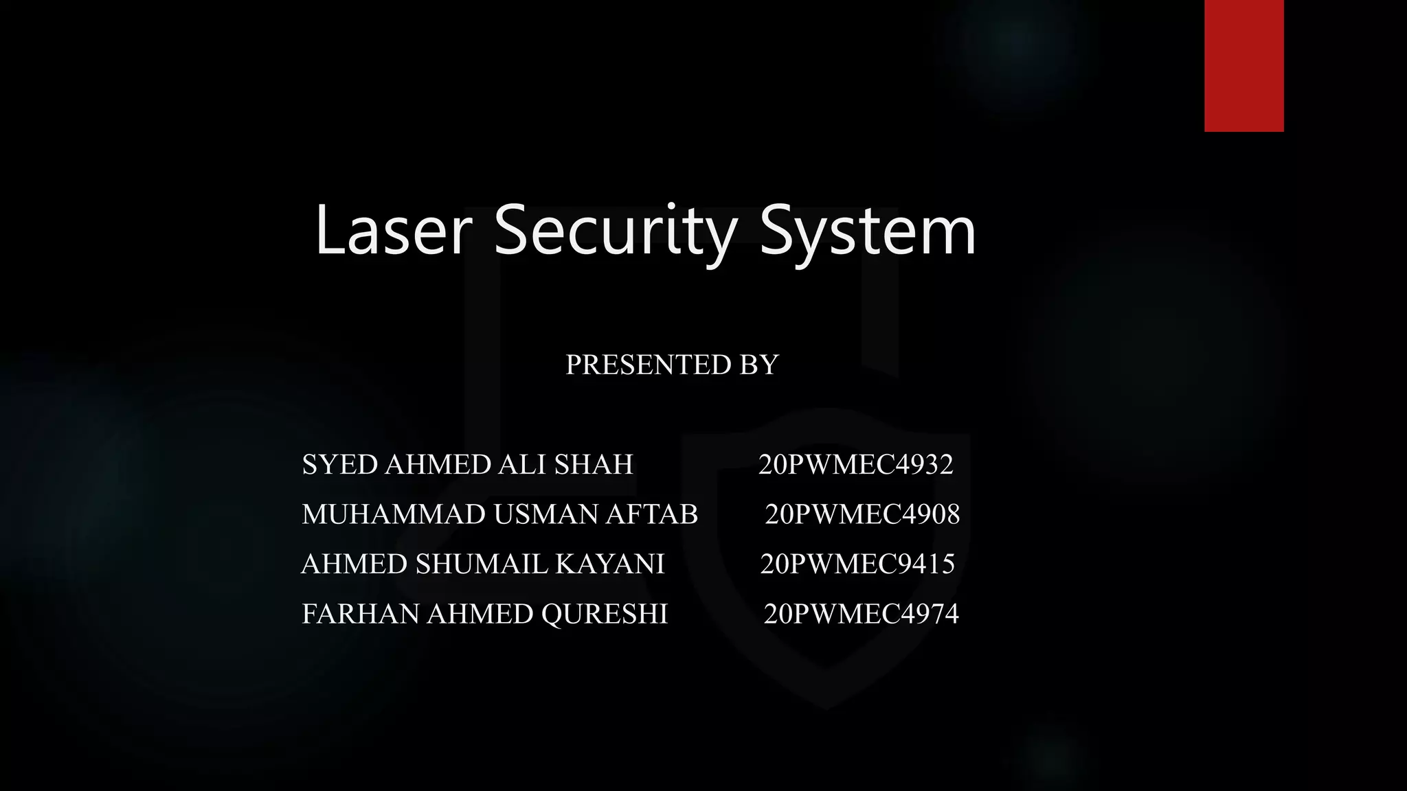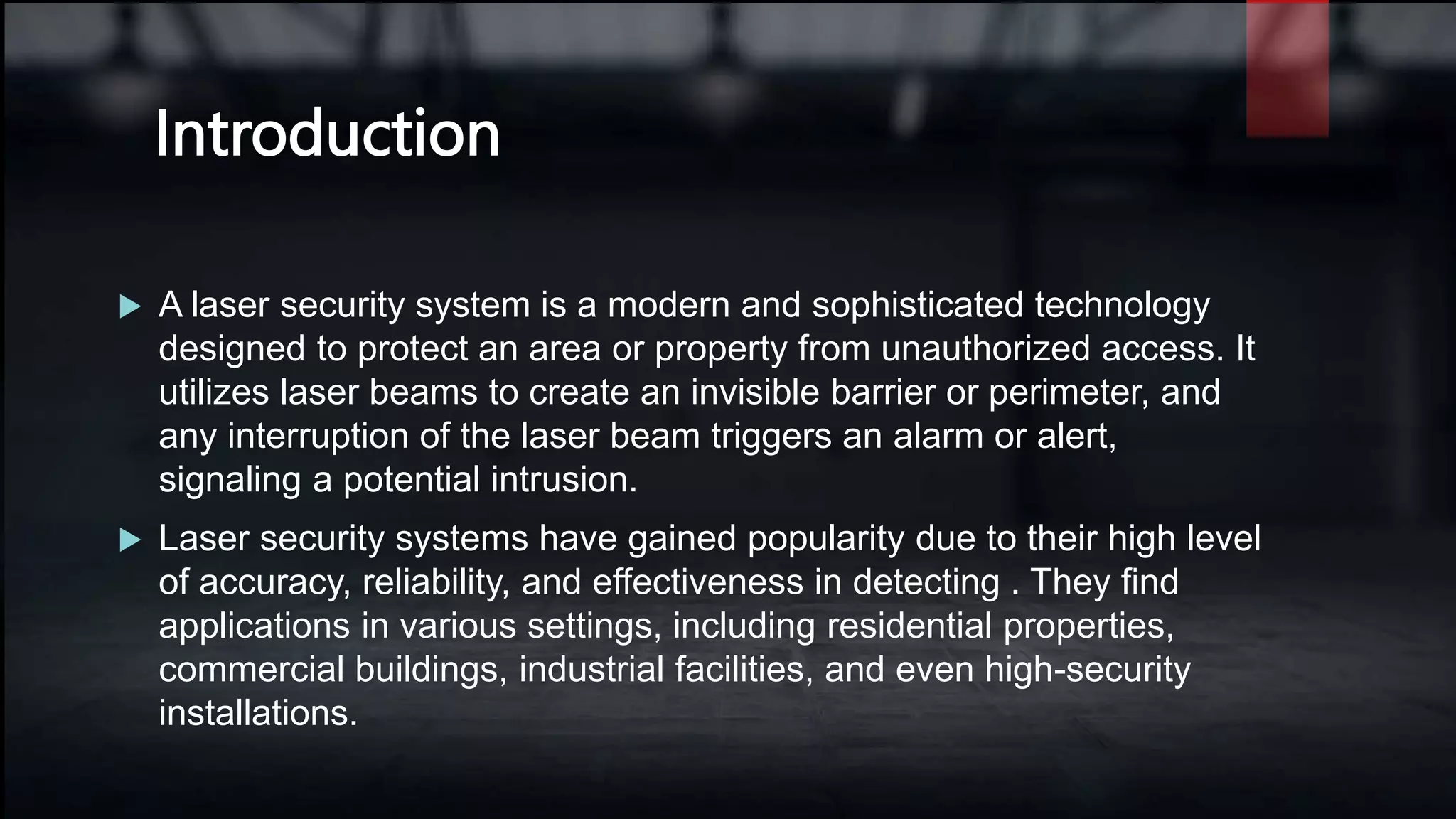 A laser security system uses laser beams to create an invisible barrier around a protected area. Any interruption of the laser beams triggers an alarm. The system discussed uses an Arduino Uno, laser, buzzer, ultrasonic sensor, LCD, LDR, and jumpers. It works by detecting movements near the ultrasonic sensor or interruptions of the laser beams between the LDR, which triggers the buzzer and displays an alert on the LCD. The purpose is to detect unauthorized intrusions within the protected area.