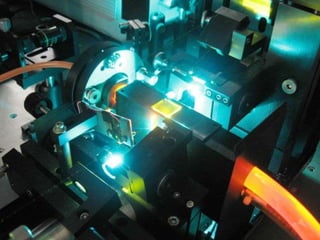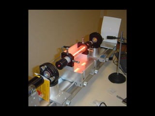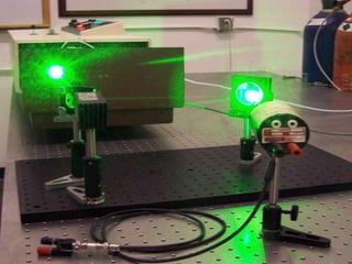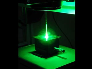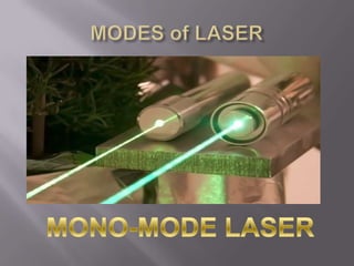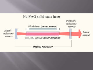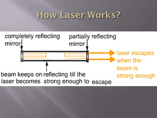 The document discusses the laser and how it works. It describes how a laser emits light through optical amplification using stimulated emission of photons. Lasers produce light that has a high degree of spatial and temporal coherence. A laser works by stimulated the emission of photons within an active medium placed between two mirrors, which results in the amplification of the photon waves into a coherent beam of light.
