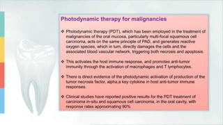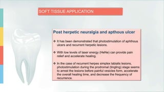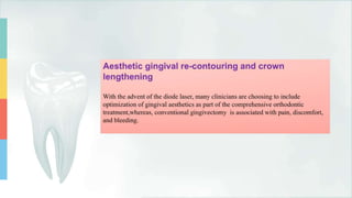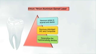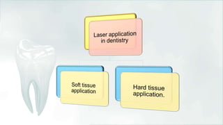 The document discusses the introduction and application of lasers in dentistry, including types such as CO2 and Nd:YAG lasers, and their mechanisms of action. It highlights their benefits, such as minimizing bleeding and promoting faster healing, as well as drawbacks, including limitations on certain dental materials and the need for anesthesia in some cases. The document concludes that while lasers cannot replace all conventional procedures, they offer innovative solutions that enhance patient care in dental practices.