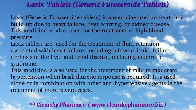 Lasix (generic furosemide) is a medication used to treat fluid retention due to heart failure, liver disease, or kidney issues, as well as high blood pressure. Each tablet contains 40 mg of furosemide and is produced by Sanofi India Limited, with various trade names available. The medication has specific dosage guidelines, contraindications, and potential side effects, including hypotension and electrolyte disturbances, and should be used with caution in certain populations.