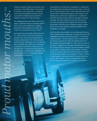 R.L. Polk, an automotive market research company, was launching into China but faced challenges with lack of brand recognition, negative perceptions of market research, and inability to pronounce their name ("Polk" was pronounced as "Pork"). The author was asked to help with the creative process. He realized the existing English marketing materials would not work when directly translated. By participating in redefining goals and developing new creative solutions like a timeline of Polk's history and providing a phonetic translation, the author helped ensure the launch was a success and Polk's meaning and brand was effectively communicated and aligned with the Chinese audience.