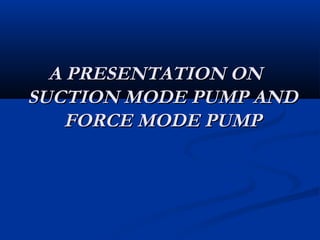 This document discusses suction mode pumps, force mode pumps, and centrifugal pumps. It provides details on the key parts and functions of suction mode pumps including the seal, shaft, impeller, bearing, and casing. Centrifugal pumps are described as having a simple construction, producing a constant discharge, and being easy to operate. Submersible pumps are discussed as examples of force mode pumps, with applications in drainage, sewage, and industrial pumping. The document concludes with thanks to all attendees of the presentation.