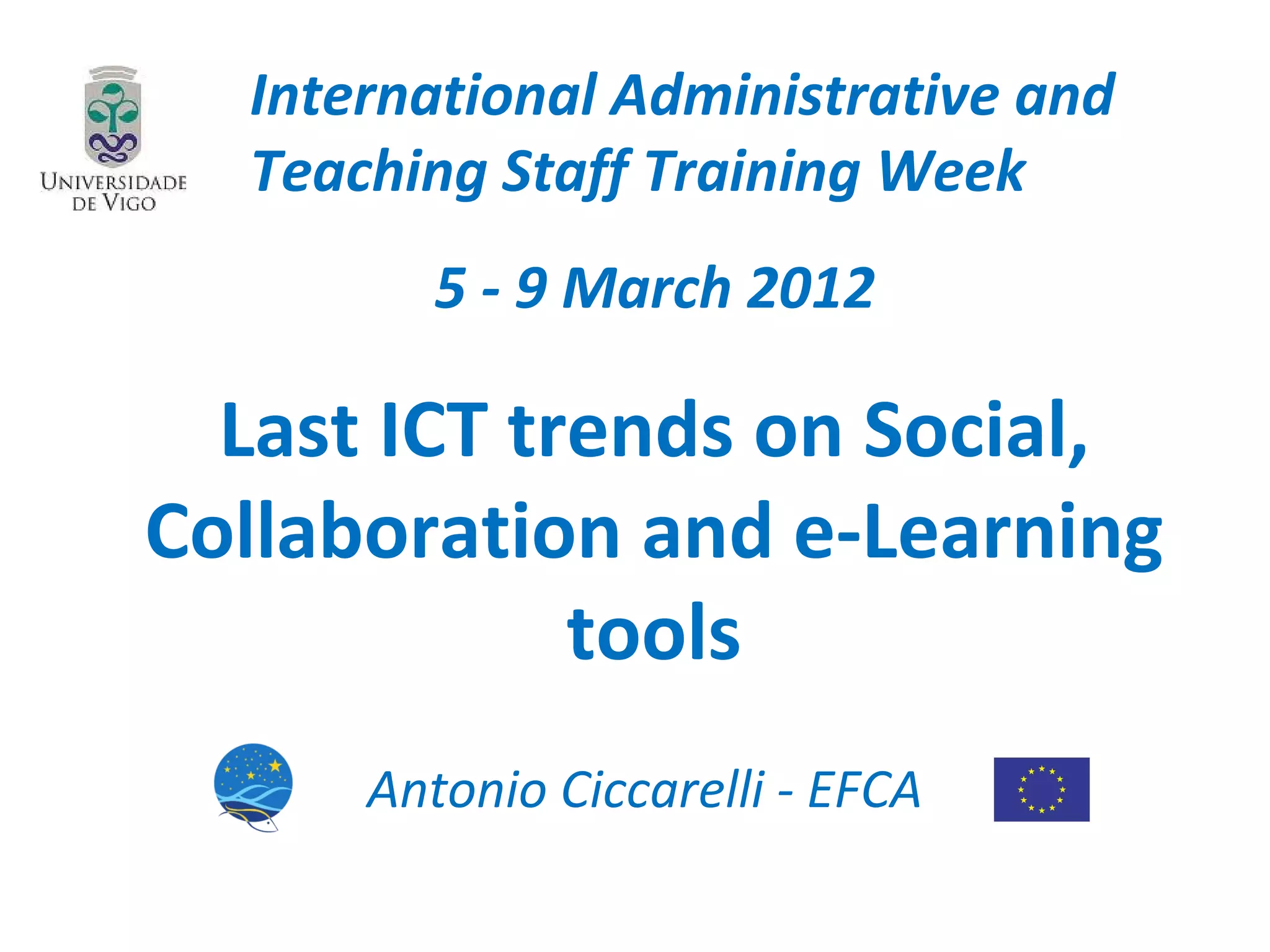 The document outlines key trends in information and communication technology (ICT) and e-learning, highlighting the end of the PC age, the rise of consumerization, and the shift towards cloud-based solutions. It discusses the importance of social networks, unified communication, and collaborative tools in education, alongside various e-learning models and delivery methods. The author emphasizes the continuous changes in the ICT sector and the affordability of advanced e-learning solutions for schools and universities.