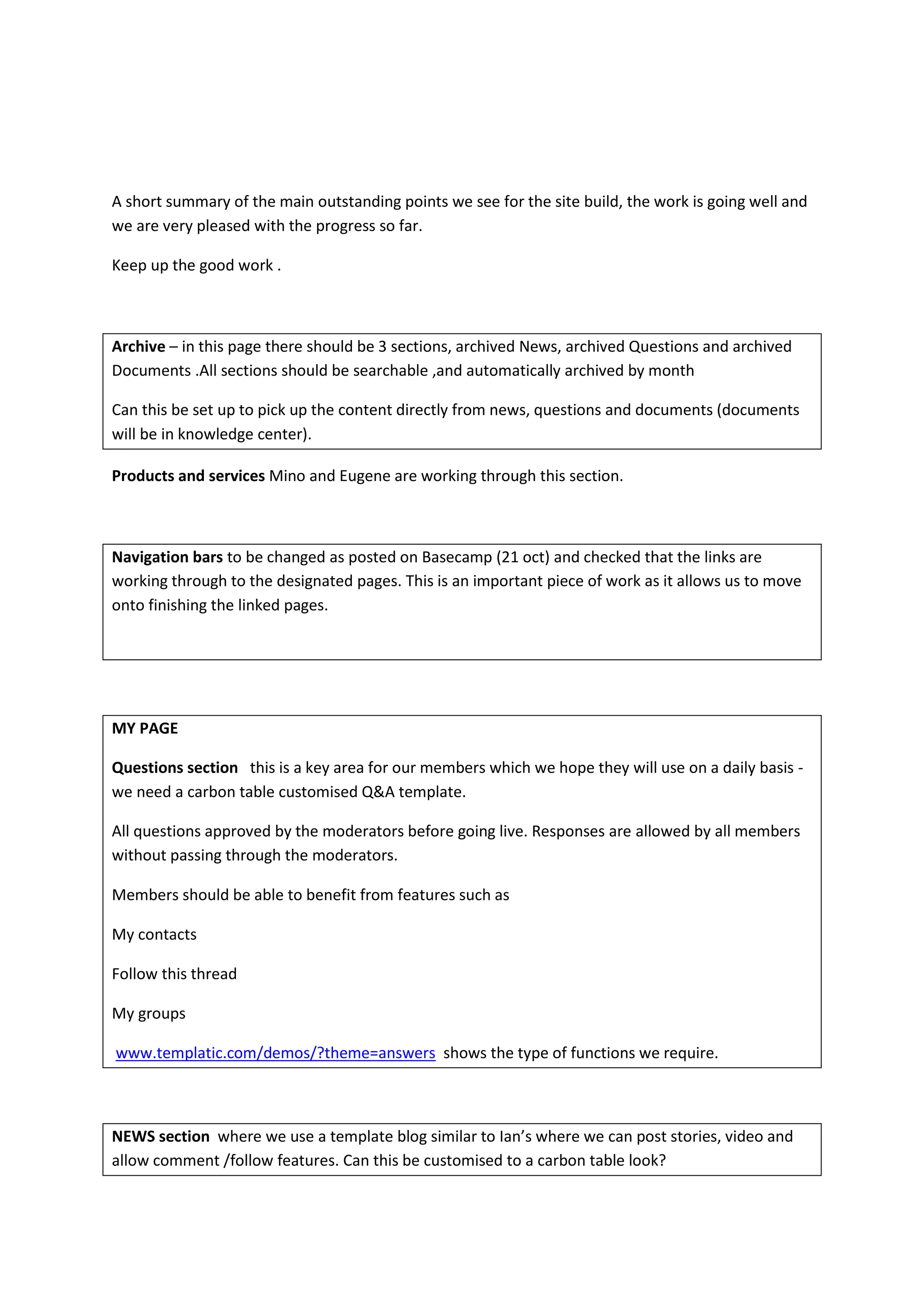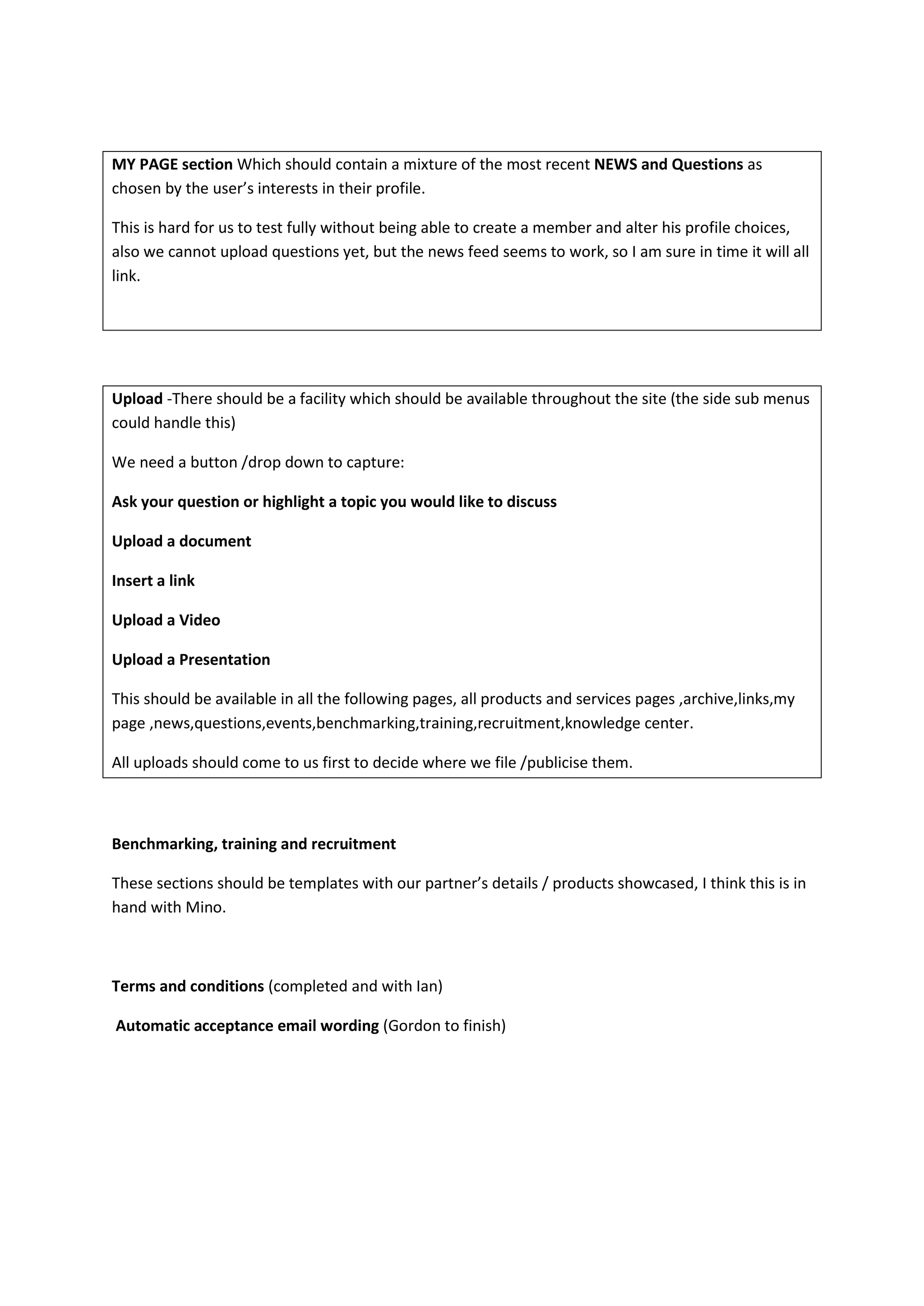 This document provides an overview of the sections and features needed for a website build. It discusses setting up archive, navigation, questions, news, and my page sections. It also outlines a need for a uniform upload button across the site to submit questions, documents, links and videos. Benchmarking, training and recruitment sections will feature partner details. Terms and conditions and acceptance emails also need to be completed.