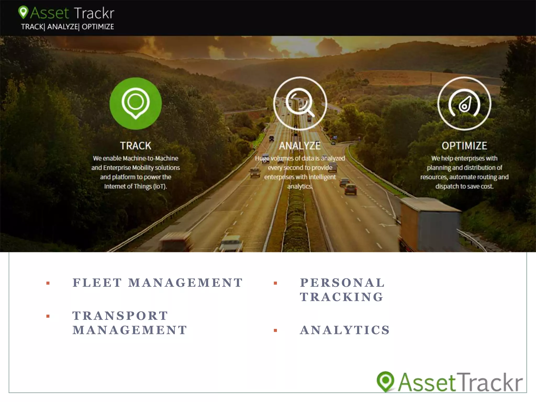 AssetTrackr is a fleet management, transport management, and personal tracking company. It provides analytics and solutions for fleet management, transport management, order allocation and route optimization, truck fill estimation and optimization, assisted picking, and workforce management. The company was founded by Ashok Yerneni and Vikas Minda and aims to help brands track, analyze, and optimize their assets and operations.