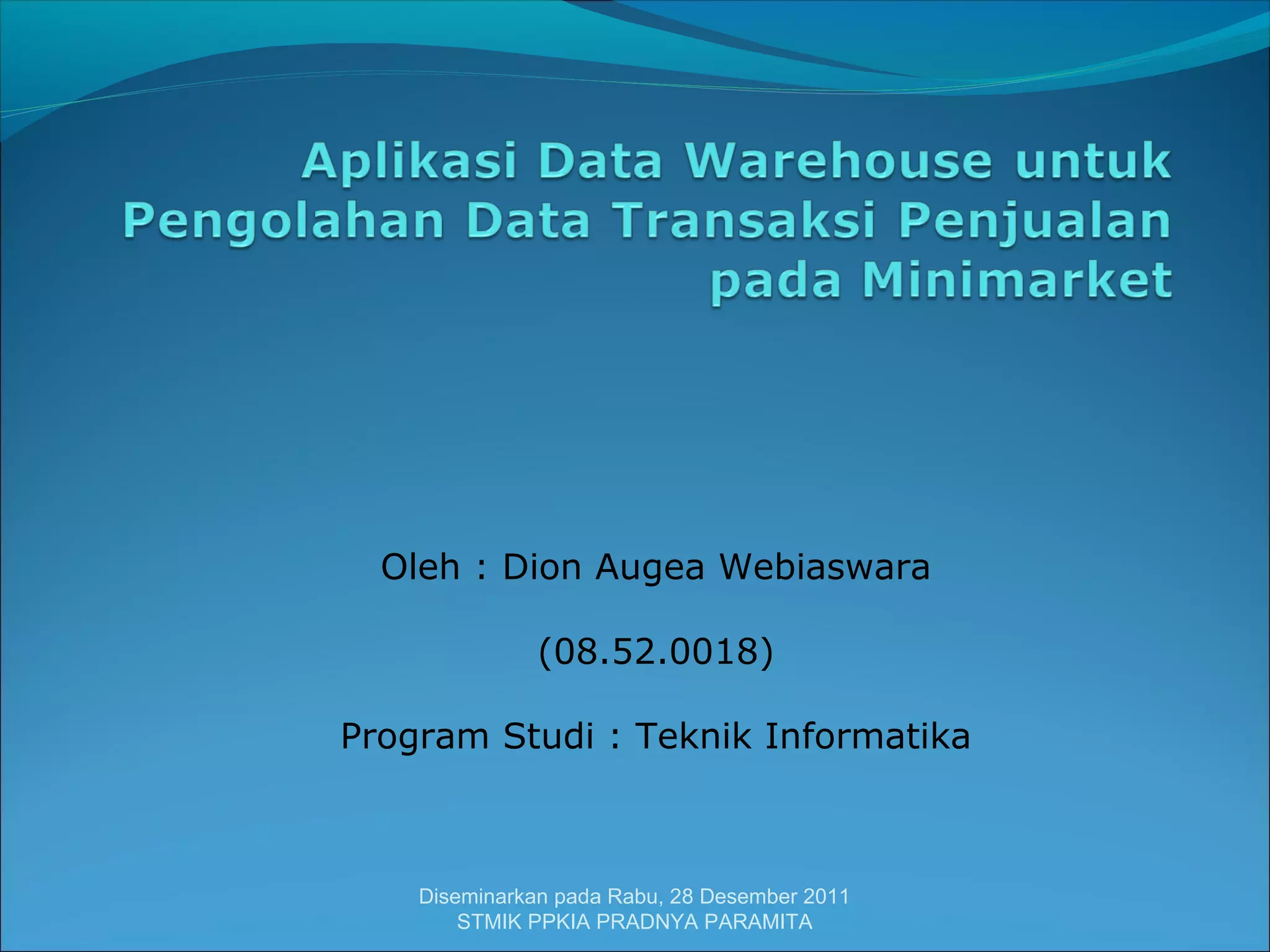 Dokumen ini membahas tentang penerapan data warehouse untuk mengolah volume data transaksi penjualan yang besar dari basis data operasional minimarket secara otomatis dan terdistribusi untuk keperluan pembuatan laporan.