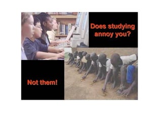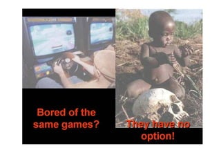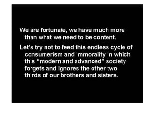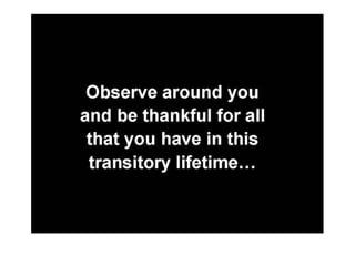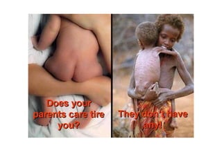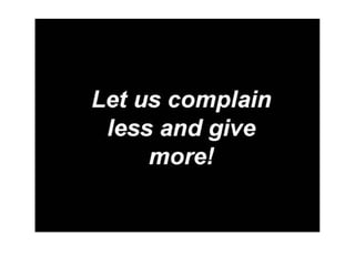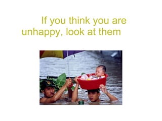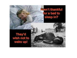 This document suggests that while people may feel unhappy with their lives or situation, they should be grateful for what they have because others have it much worse. It encourages counting blessings rather than complaints, and focusing on pursuing the few things that truly matter to one's heart rather than superficial distractions.