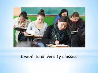 This document describes a person's daily activities which included going to university classes, eating ice cream with friends, visiting the mall with parents, working as a waitress, visiting grandparents, doing homework, and going to sleep.