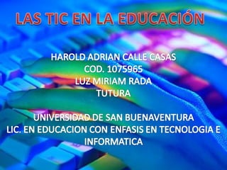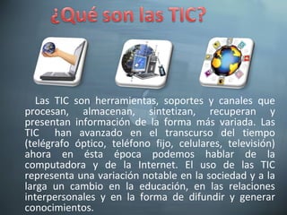 Las TIC son herramientas como la computadora e Internet que procesan y presentan información. El uso de las TIC ha cambiado la sociedad y la educación al facilitar nuevas formas de aprendizaje, comunicación y generación de conocimiento. Aunque los docentes a veces temen lo complejo de las TIC, éstas ofrecen nuevos procesos de enseñanza como el acceso a información y canales de comunicación que no requieren coincidir en el espacio y tiempo. La utilización de las TIC en la educación es importante para que más personas aprendan