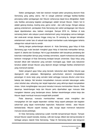 Dokumen tersebut membahas rencana perencanaan dan perancangan Semarang Entertainment Center. Dokumen menjelaskan latar belakang dibutuhkannya fasilitas hiburan di Kota Semarang, tujuan pembangunan SEC untuk menjadi destinasi baru bagi warga, serta pendekatan yang akan digunakan dalam perencanaan dan perancangan SEC yang meliputi studi lapangan, studi pustaka, dan studi banding.