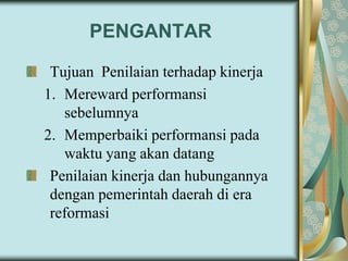 Dokumen ini membahas kompetensi dan sistem penilaian kinerja, termasuk berbagai teknik seperti ratings, rankings, dan MBO, yang mempunyai kelebihan dan kekurangan masing-masing. Diuraikan juga model penilaian kinerja yang berbeda dan mengusulkan perlunya penyesuaian metode penilaian dengan kondisi organisasi. Rekomendasi di akhir menyatakan perlunya inovasi dalam pengukuran kinerja pemerintah untuk mencapai hasil yang lebih baik.
