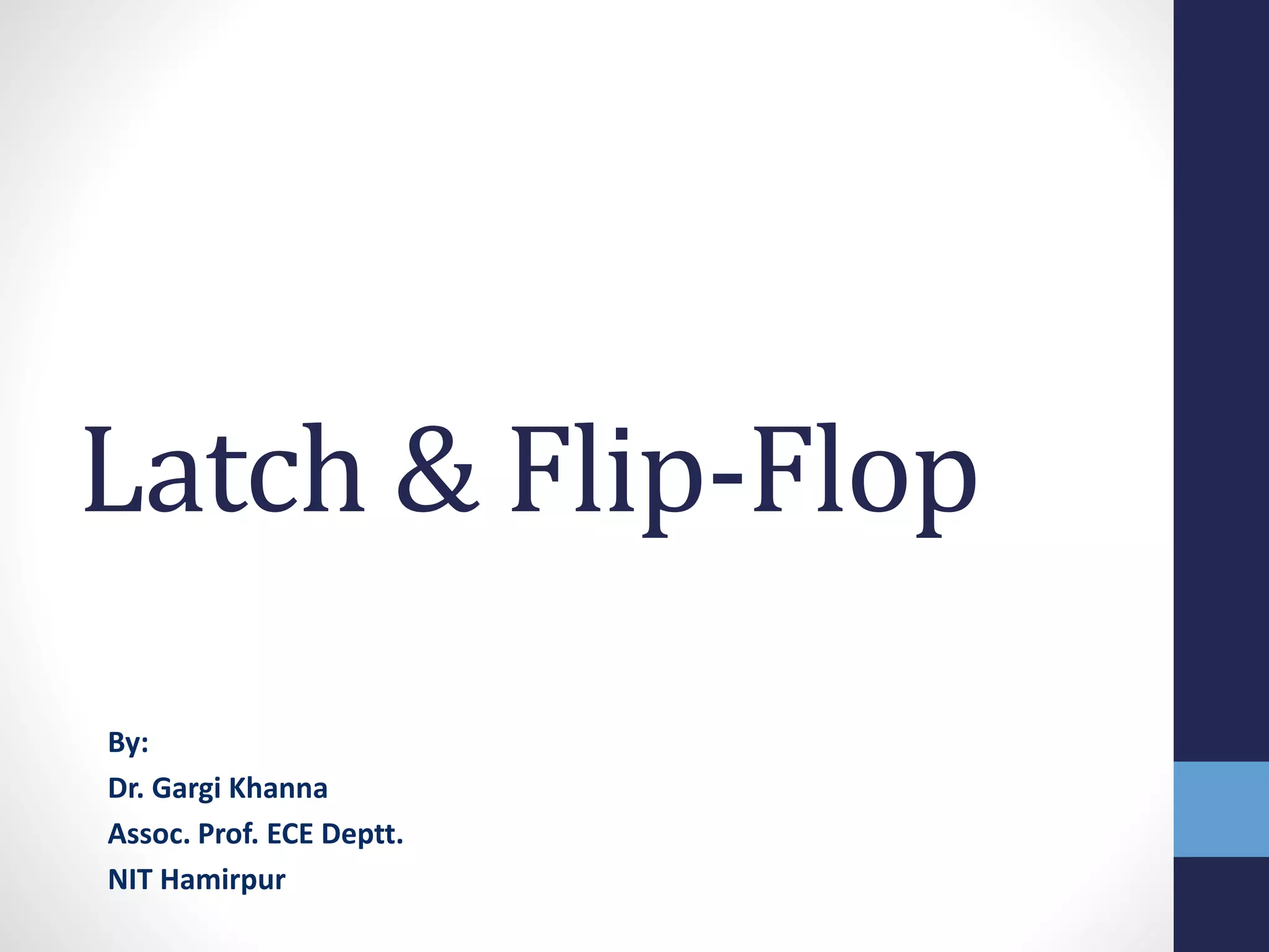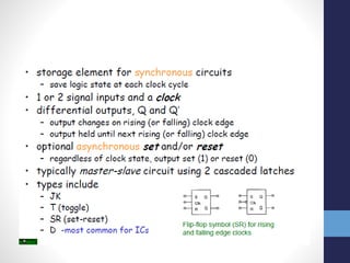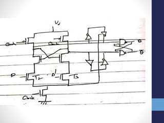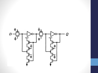 The document discusses latches and flip-flops. It describes how a latch stores a data value and is non-volatile, while a flip-flop is built from two back-to-back latches clocked on opposite phases. Various latch and flip-flop circuit designs are presented, including pass transistor, transmission gate, buffered input/output, and master-slave designs. Features like enables, resets, and sets are also discussed along with their synchronous and asynchronous implementations in flip-flops. Different flip-flop circuit styles are covered such as transmission gate, complementary CMOS, precharge, and self-gating designs.