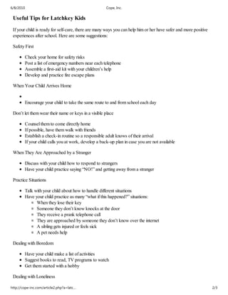 This article discusses guidelines around leaving children home alone or having them care for younger siblings. It notes that laws vary by location but typically consider a child's age and development. Examples are given showing that in some areas, children under age 8 cannot be left alone, and children ages 8-10 may be alone for up to 90 minutes. The article also provides tips for latchkey kids, such as establishing safety plans, check-in routines, and ways to handle emergencies or feelings of loneliness.