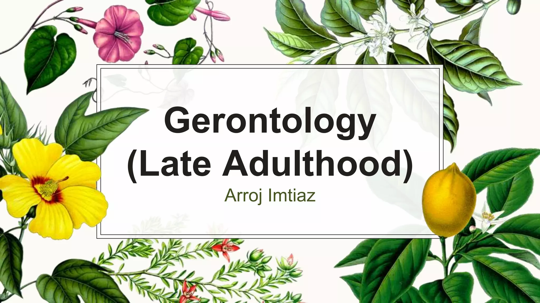 Gerontology is the scientific study of aging and the specific challenges faced by older adults, particularly after the age of sixty-five, marking the start of late adulthood. This period is characterized by physical, cognitive, and emotional changes, including health issues, memory declines, and adjustments to retirement and aging. Despite the challenges, many individuals adapt successfully, with ongoing personal growth and increasing significance of social connections and spirituality.
