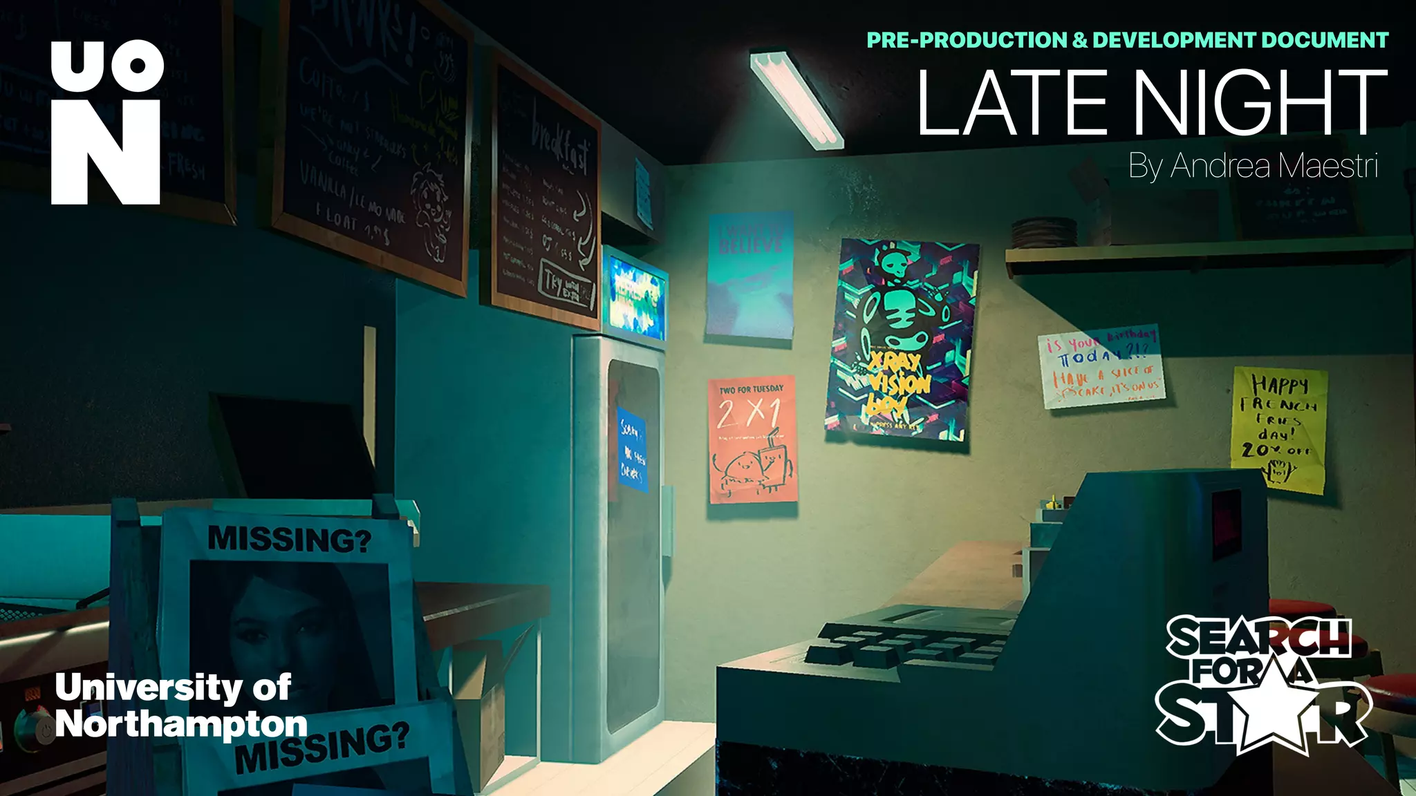 This document provides an overview and development process for a game environment art project titled "Late Night." The artist was inspired by neo-noir films, TV shows, and games. They researched these influences and created mood boards. Concepts developed included a reimagined lunch counter setting. Production involved blocking out the scene, creating materials and lighting, modeling assets, and applying post-processing effects to achieve the desired neo-noir visual style. The artist focused on showcasing skills in art direction, lighting, materials, and presentation within technical constraints for their portfolio piece.