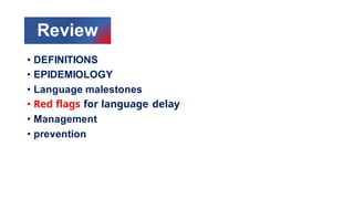 This document provides an overview of late talking in young children. It defines key terms related to language and discusses the epidemiology of language delays. Red flags for language delays are outlined for different age groups. Risk factors, potential causes, and the clinical presentation of language delays are reviewed. The natural history, screening recommendations, differential diagnosis, management approaches, and prevention strategies for language delays in young children are summarized.