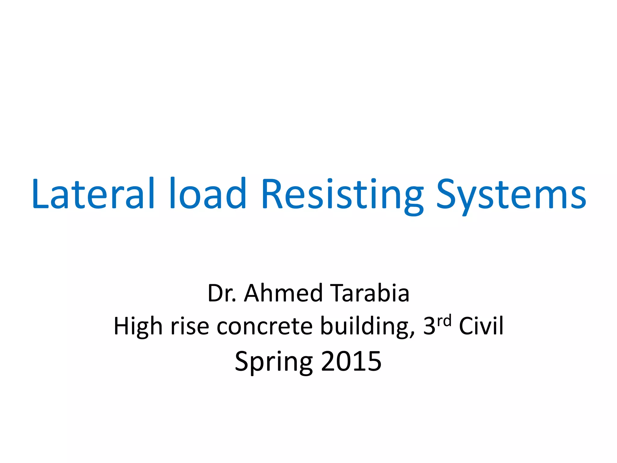 The document discusses lateral load resisting systems in high-rise concrete buildings, detailing types such as moment-resisting frames and shear walls, as well as their combinations. It covers key concepts including the definition of the center of rigidity, methods for distributing lateral loads, and the evaluation of structural stability through critical parameters. Practical examples illustrate calculations for effective inertia and load distribution among various structural frames.