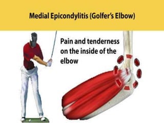 Tennis elbow and golfer's elbow are forms of elbow tendinitis caused by overuse and repetitive strain on the tendons in the forearm. Tennis elbow involves the tendons on the outside of the elbow and is more common, while golfer's elbow affects the inner tendons. Both result from repetitive motions like swinging, gripping, or flexing and can be treated with rest, anti-inflammatories, bracing, and physical therapy.