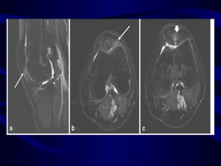 Lateral patellar compression syndrome is caused by improper tracking of the patella in the femoral trochlear groove without instability. It is associated with increased pressure on the lateral facet due to tight lateral soft tissues. Patients present with chronic anterior knee pain that is exacerbated by activities like stairs and sitting. Examination reveals tenderness over the lateral patella. Treatment begins with physical therapy focusing on vastus medialis strengthening. For refractory cases, arthroscopic lateral release can provide relief by correcting the lateral tilt.