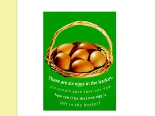 The document is a comprehensive presentation on lateral thinking, structured as a two-day training program focusing on creativity and problem-solving techniques inspired by Edward de Bono. It includes various exercises, puzzles, and strategies aimed at cultivating innovative thinking and challenging assumptions in order to enhance creativity in a workplace setting. The content emphasizes the importance of exploring multiple perspectives and breaking free from traditional thought patterns to generate unique solutions.