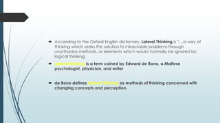Lateral thinking, coined by Edward de Bono, encourages creative problem-solving through unconventional reasoning and redefining concepts. It highlights that creative insights often come from thinking differently about well-known issues, as demonstrated by various puzzles illustrating non-obvious solutions. The document includes several lateral thinking puzzles to enhance this approach to reasoning.