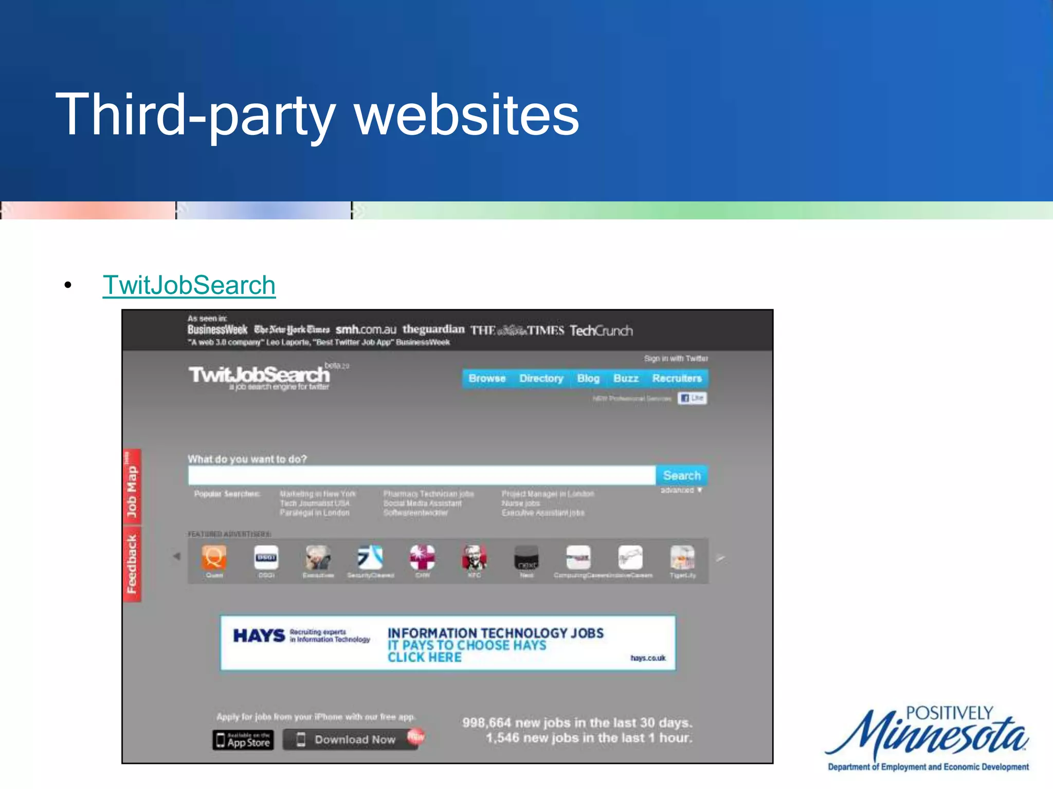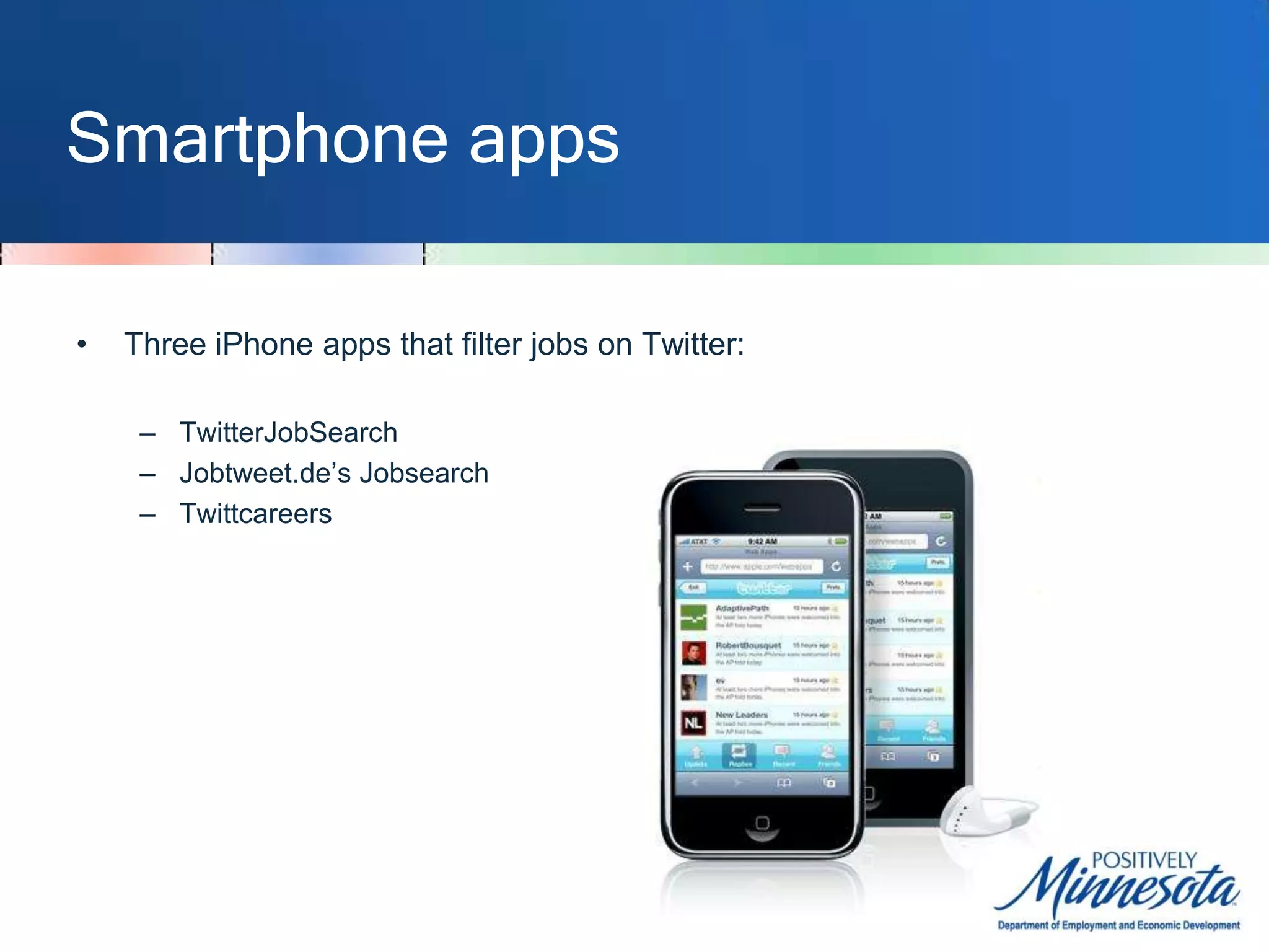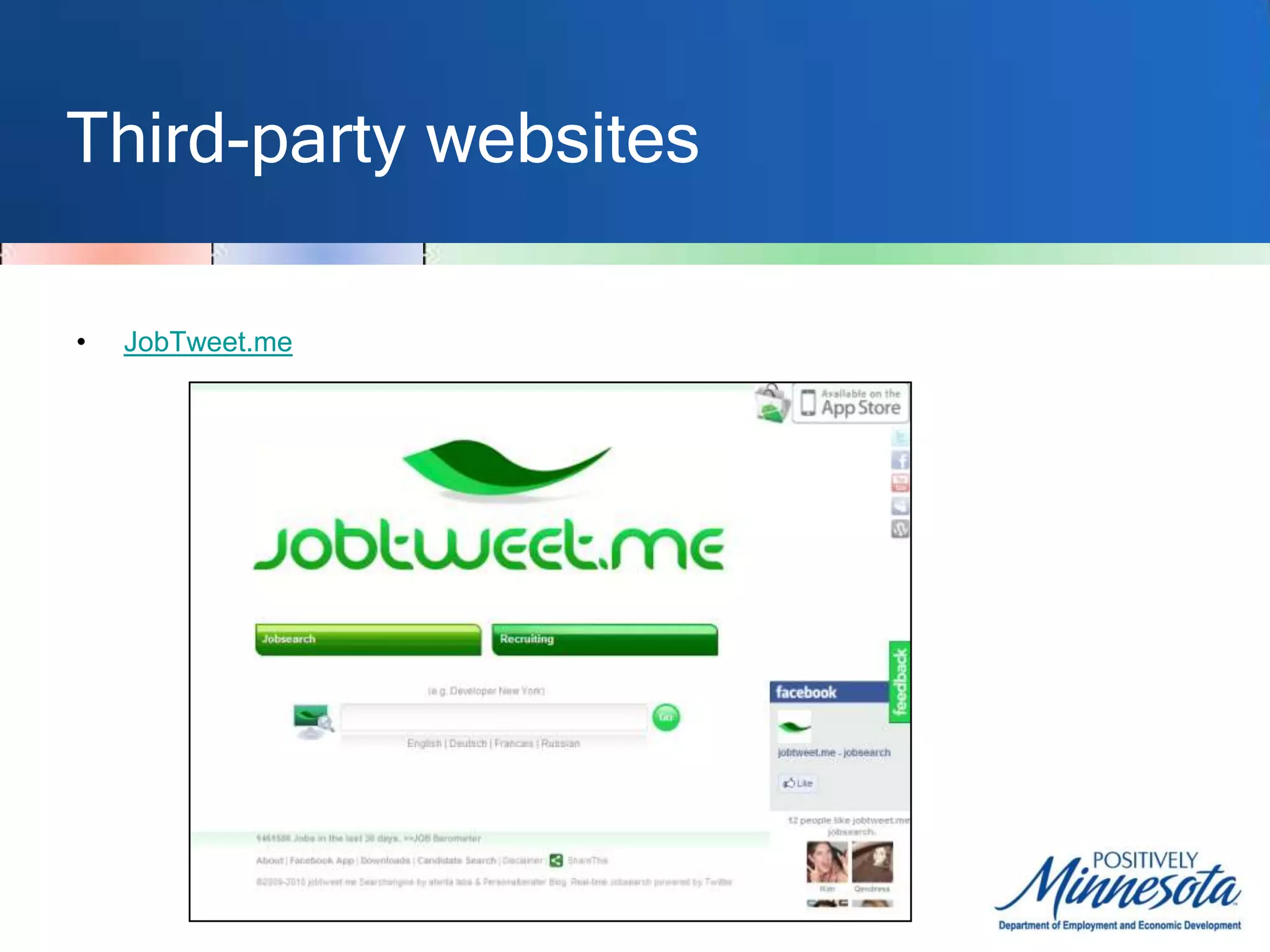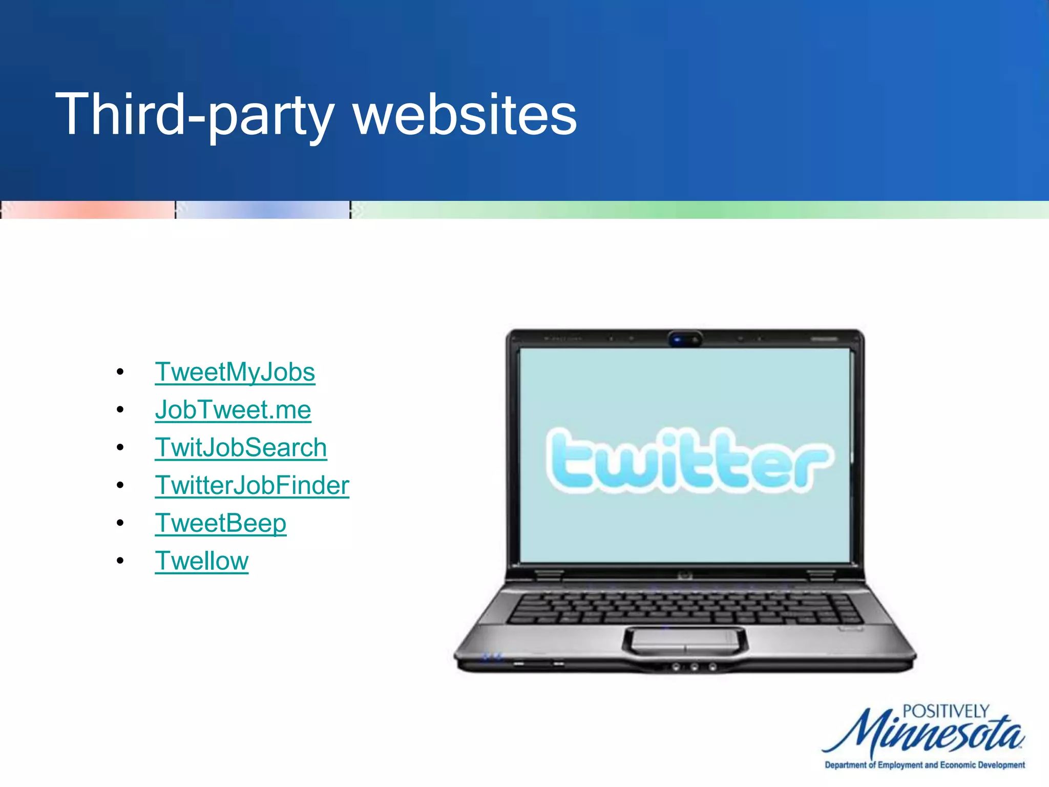 The document discusses resources for job seekers to use social networking sites like Twitter and LinkedIn to find jobs and networking opportunities. It provides tips on using advanced search functions on Twitter to search for job postings by location, industry, or keywords. Third-party websites and smartphone apps are described that can help filter Twitter for relevant job tweets. Traditional associations and directories are listed as networking resources, as well as modern sites like Meetup and LinkedIn where users can connect with others in their field.