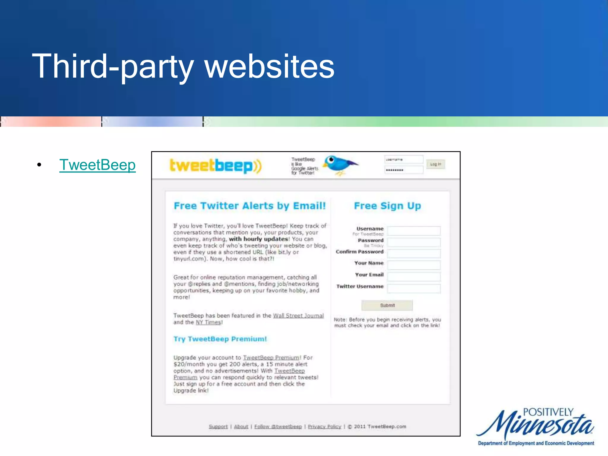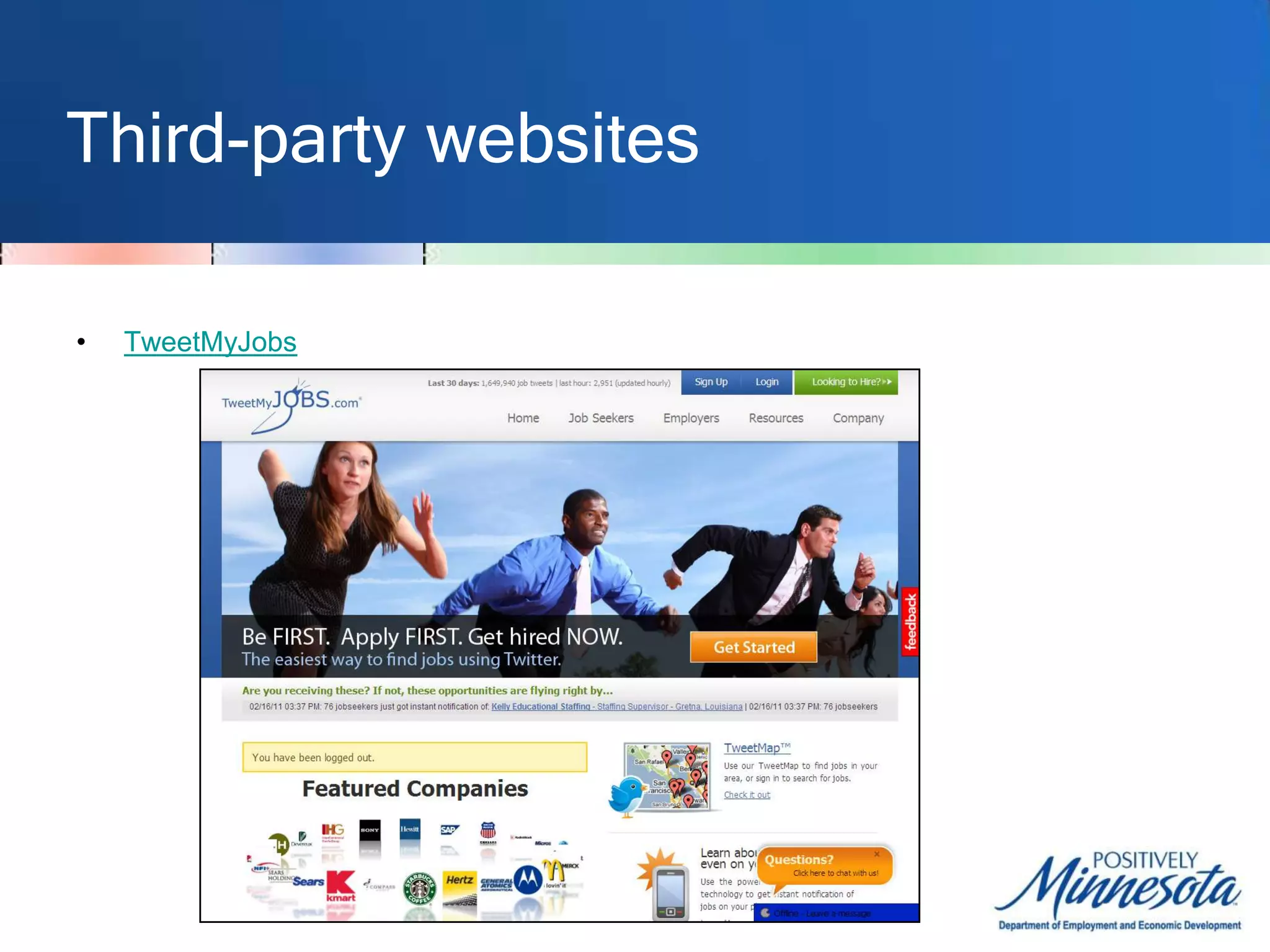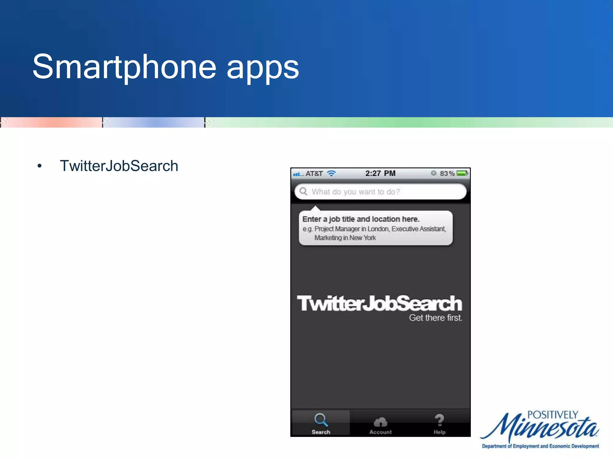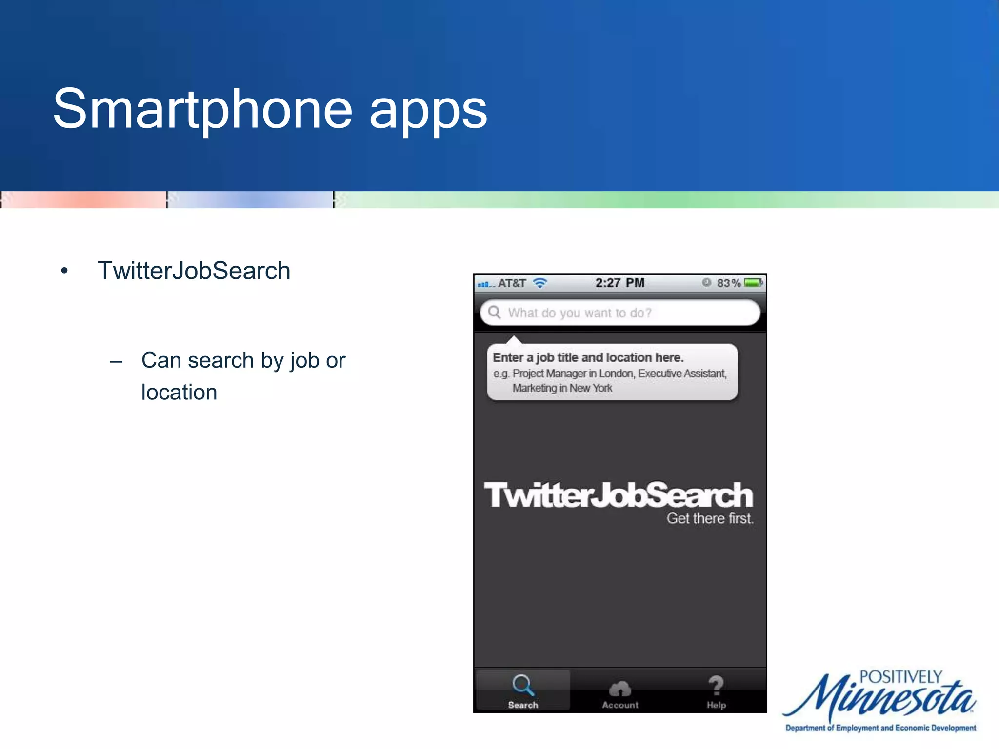 The document discusses resources for job seekers to use social networking sites like Twitter and LinkedIn to find jobs and networking opportunities. It provides tips on using advanced search functions on Twitter to search for job postings by location, industry, or keywords. Third-party websites and smartphone apps are described that can help filter Twitter for relevant job tweets. Traditional associations and directories are listed as networking resources, as well as modern sites like Meetup and LinkedIn where users can connect with others in their field.