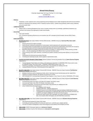 Ahmed Yehia Elswesy is seeking an entry-level technical management position where he can utilize his 12 years of experience in industrial and maritime maintenance and machinery control. He holds a Bachelor's degree in Electrical Engineering and various technical certifications. His career includes roles as a Technical Office Team Leader and Senior Electrical Engineer at container terminals in Egypt and Saudi Arabia where he oversaw maintenance, commissioning of new equipment, and problem solving.
