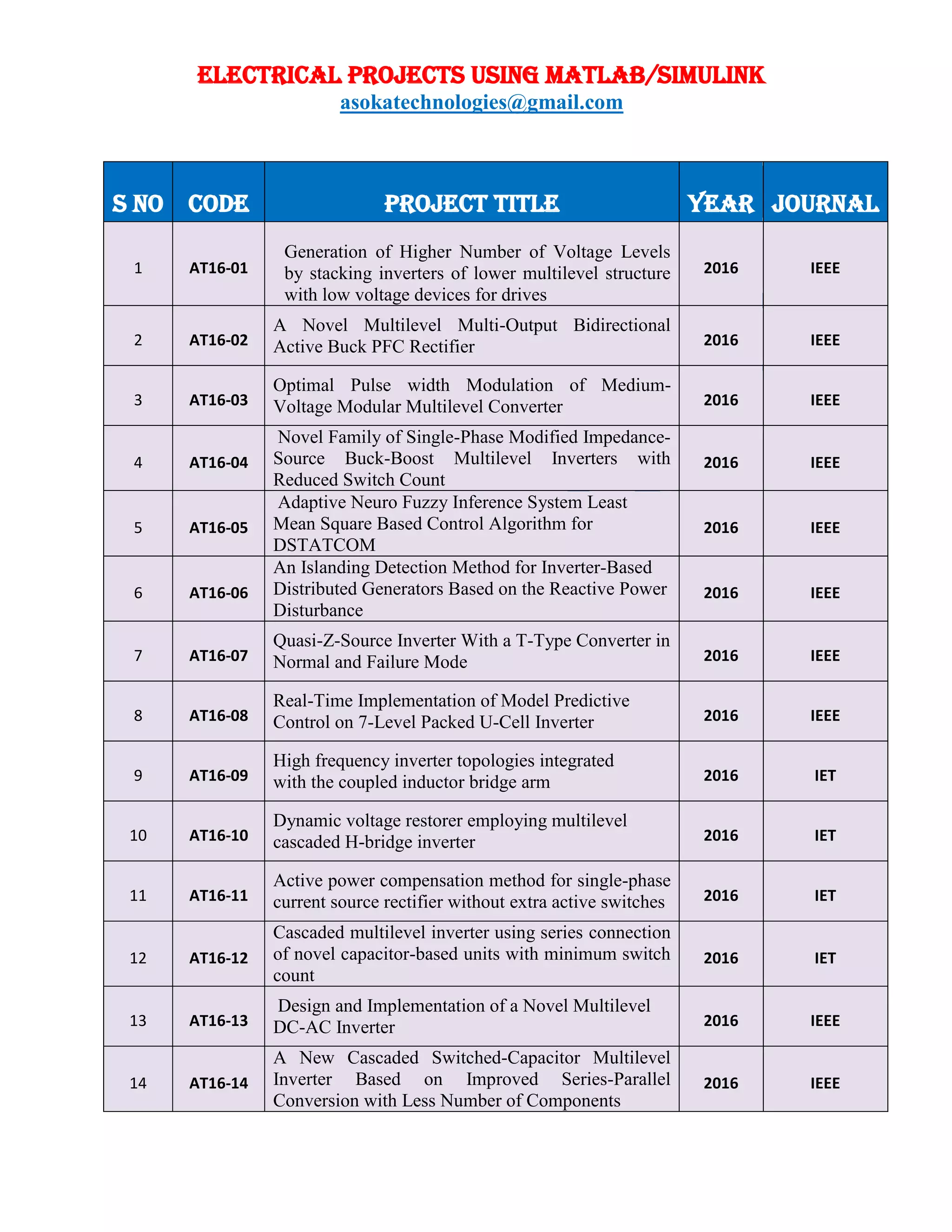 The document outlines various electrical engineering projects that utilize MATLAB/Simulink, primarily aimed at students and professionals in the field. It includes a list of project titles spanning from 2013 to 2016, each associated with an IEEE or IET journal, focusing on topics such as power electronics, multilevel inverters, and renewable energy systems. The document also offers services for developing project ideas, writing papers, and guidance for publishing.