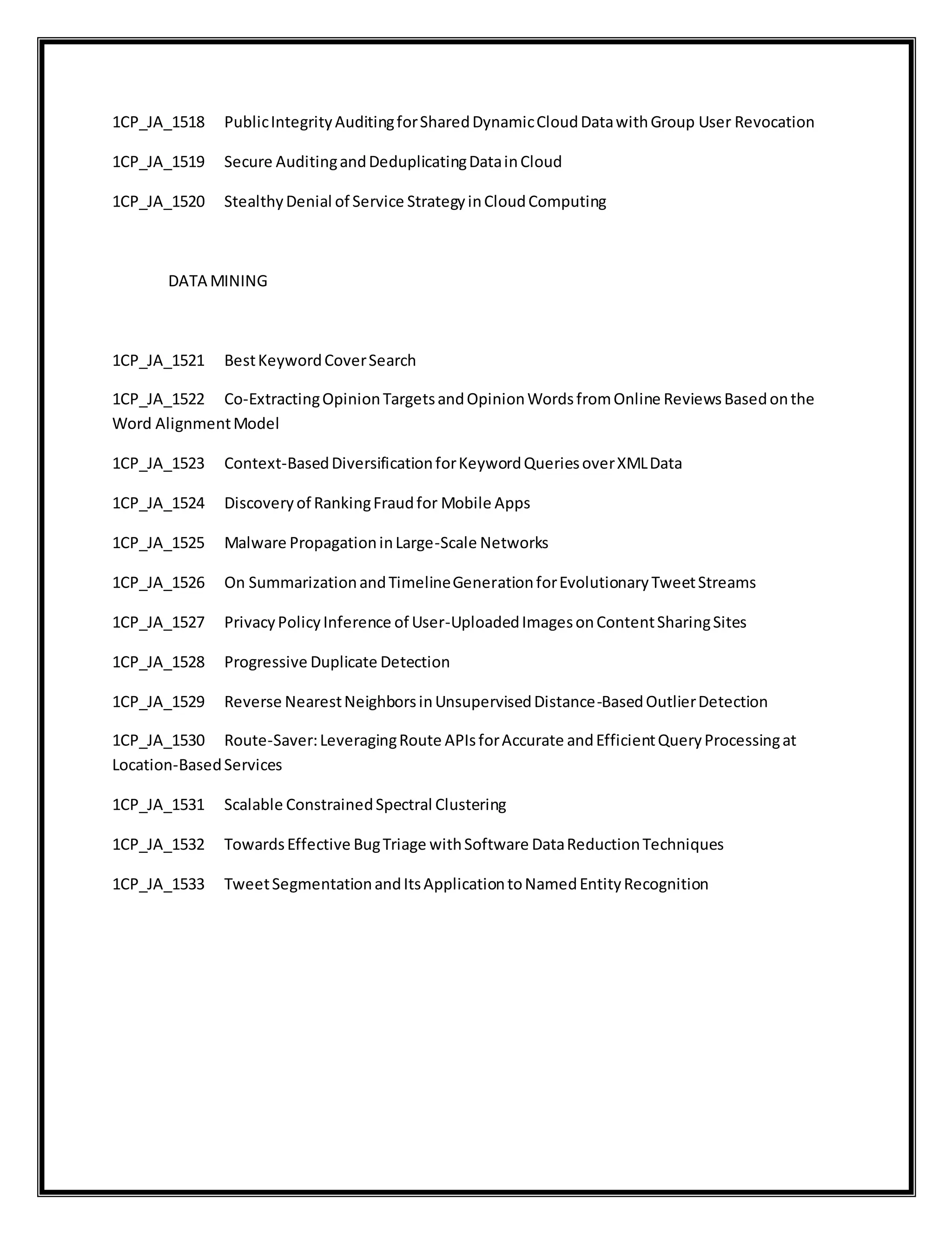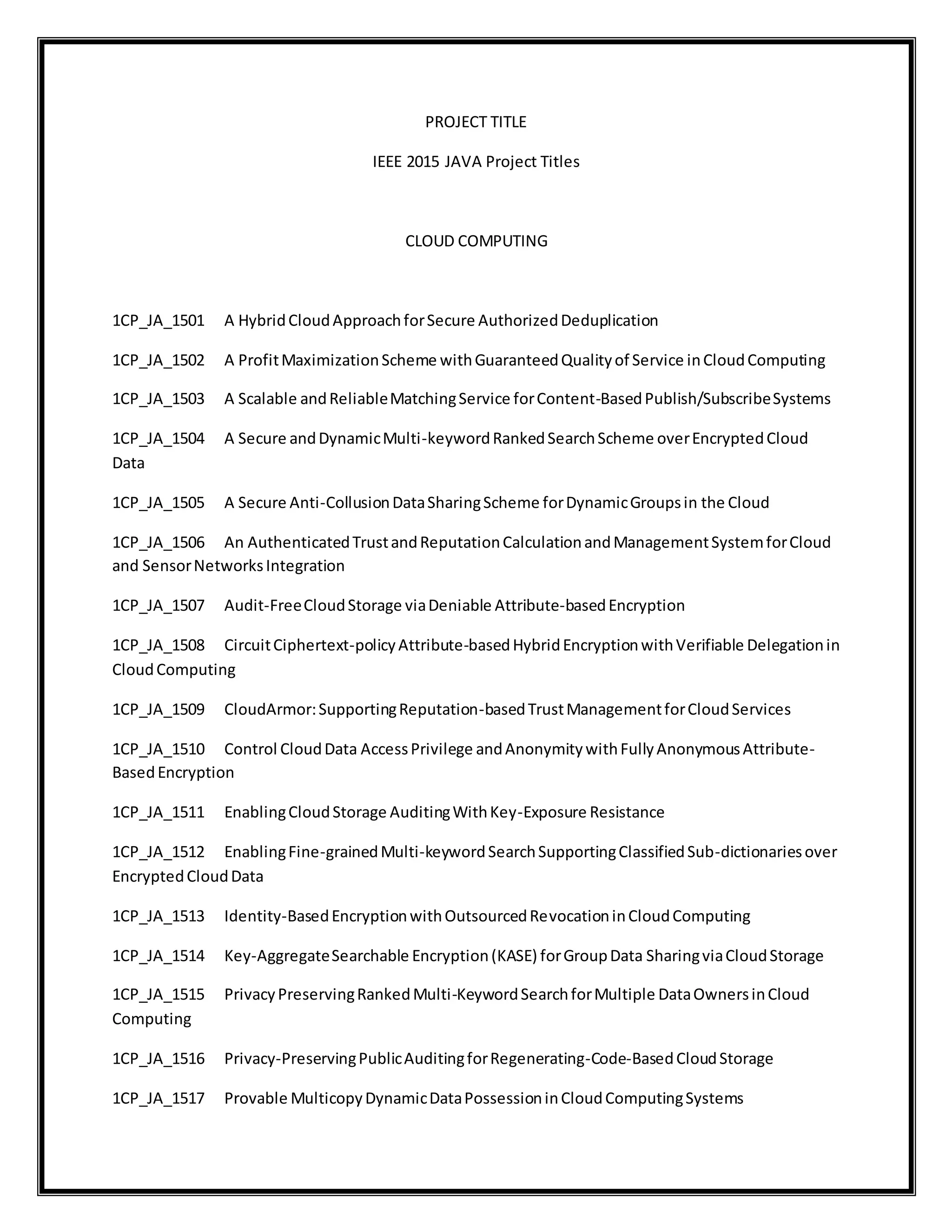 This document contains titles for projects presented at the 2015 IEEE Java conference. There are over 60 project titles listed across various topics including cloud computing, data mining, networking, mobile computing, secure computing, parallel and distributed systems, information forensics and security, image processing, and web services. The projects focus on techniques related to security, data analysis, distributed systems, and more.
