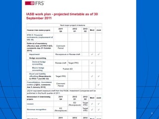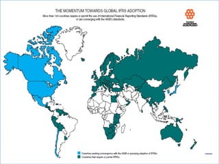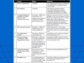 - The document summarizes recent developments in International Financial Reporting Standards (IFRS), including delays in convergence projects between the IASB and FASB, new standards and pronouncements issued, and differences in IFRS adoption across countries.