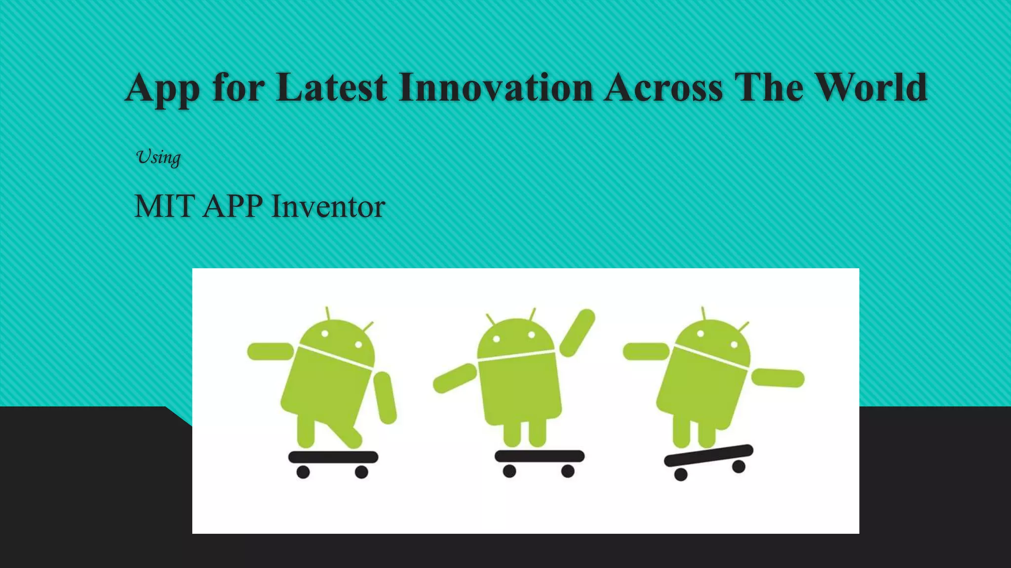 This app provides information on the latest innovations from around the world across different fields. The home screen displays images of various innovations. Users can then learn more by selecting buttons for specific innovation categories like solar energy, wind energy, rural development, and household gadgets. Each category button leads to another screen with links to websites describing new innovations in that field. The app also includes an about screen with details on the app and a references section listing sources of information.